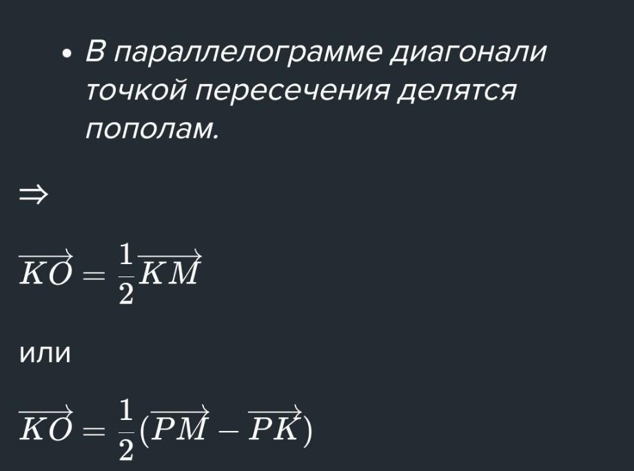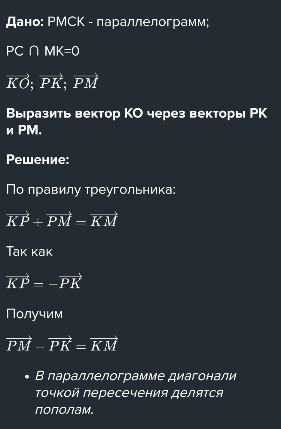 Диагонали параллелограмма PMCK пересекается в точке O. выразите вектор КO через векторы PK и PM