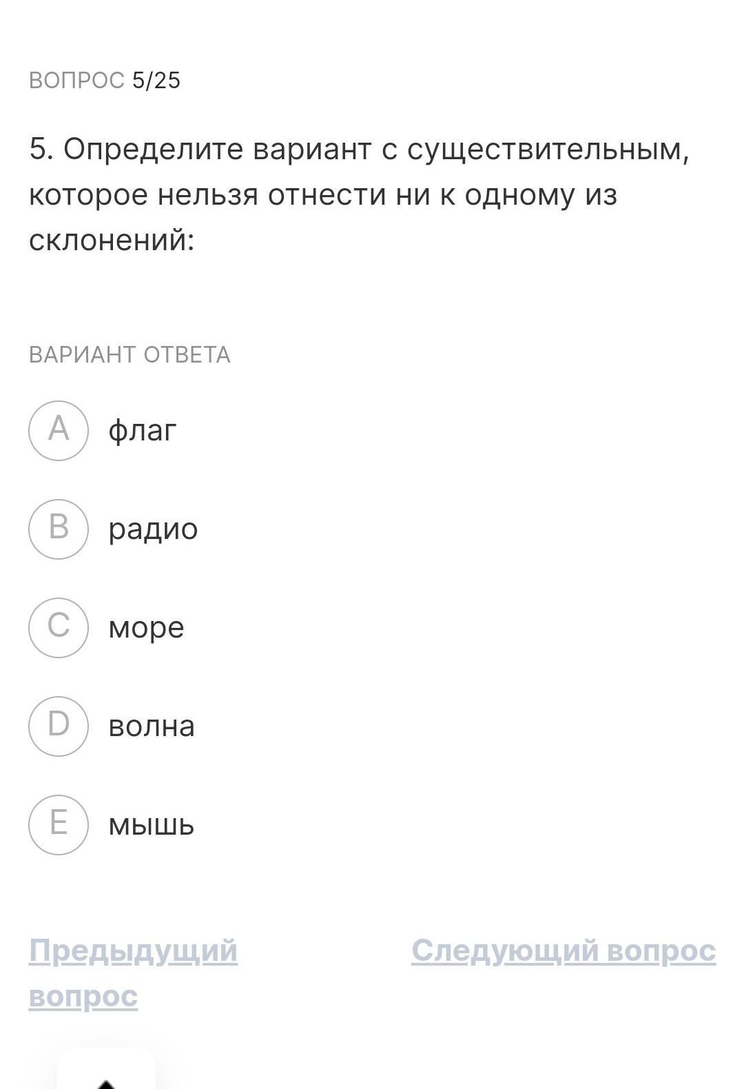определите вариант с сущевствительным, которое нельзя отнести ни к одному из склонений: 1)флаг 2)радио 3) море 4)волна 5)мышь. ПОМОГИТЕЕЕЕ СРОЧНООО