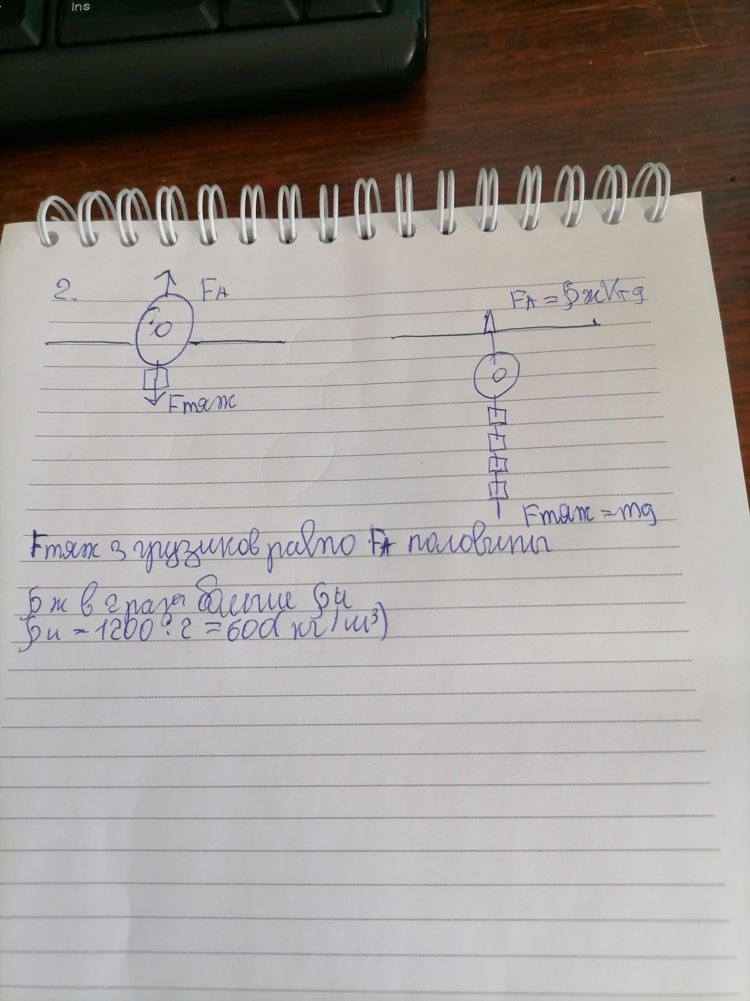 У мальчика Саши есть набор одинаковых гирек и игрушка в виде шара. Проводя физические эксперементы, Саша обнаружил, что игрушка плавает в жидкости с плотностью p погрузившись ровно наполовину, если к ней на ниточке привязать одну гирьку. Если же к игрушке привязать четыре таких гирьки, то она погрузится в жидкость полностью, но не утонет. При этом во всех эксперементах гирьки не касаются дна. Во сколько раз средняя плотность игрушки меньше плотности жидкости? Найти среднюю плотность игрушки, если плотность жидкости 1200кг/м³. срочно!!!