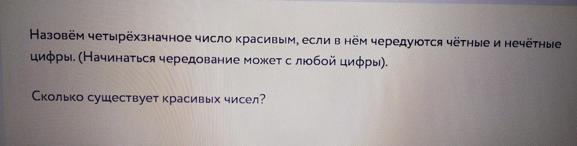 Красивое число Назовём четырёхзначное число красивым, если в нём чередуются чётные и нечётные цифры. (Начинаться чередование может с любой цифры). Сколько существует красивых