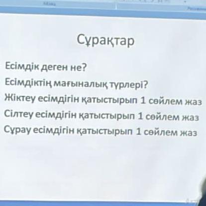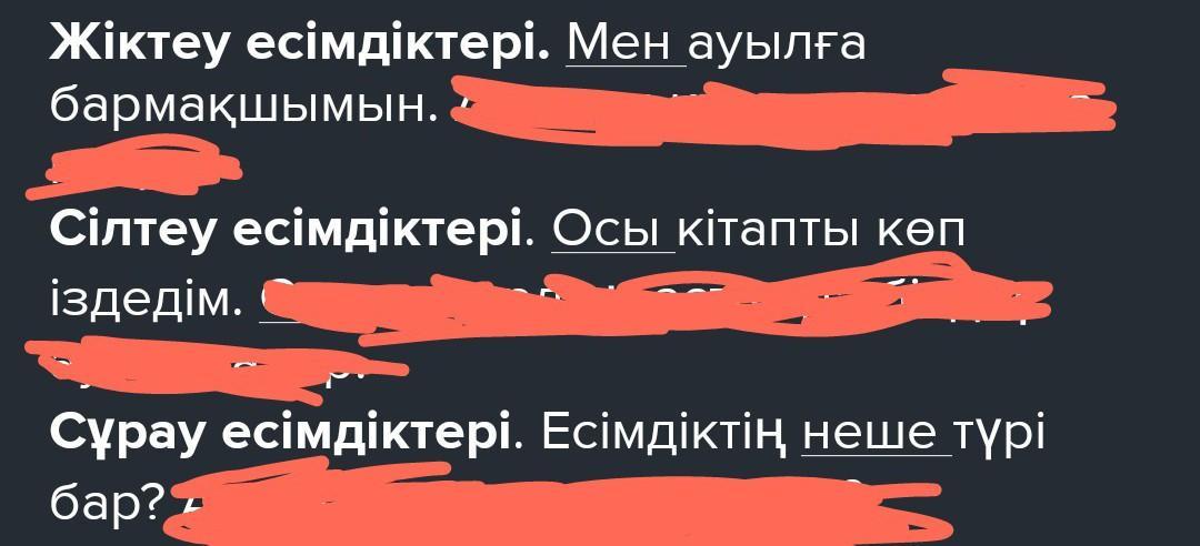 1) Есімдіктер - заттың атын, сынын, санын,олардың аттарын білдірмейтін, бірақ солардың (зат есім, сын есім, сан есімдердің) орнына жұмсалатын сөз табы. Есімідіктер белгілі бір түсінікті я ойды жалпылама түрде мегзеу арқылы білдіреді. Есімдіктердің нақтылы мағыналары өздерінен бұрын айтылған сөйлемге немесе жалпы сөйлеу аңғарына қарай айқындалады.