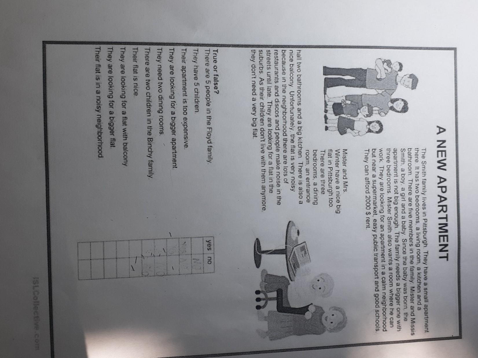 A NEW APARTMENT The Smith family lives in Pittsburgh. They have a small apartment there. It has two bedrooms, a living room, a kitchen and a bathroom. There are five members in the family Mister and Missis Smith, a boy, a girl and a baby Since the baby was born the apartment is not big enough. The family needs a bigger one with three bedrooms Mister Smith also wants a room where he can work. They are looking for an apartment in a calm neighborhood but near a supermarket, easy public transport and good schools. They can afford 2000 S rent. Mister and Mrs. Winter have a nice big flat in Pittsburgh too. There are three bedrooms, a dining room, an entrance hall two bathrooms and a big kitchen There is also a nice balcony Unfortunately, the flat is very noisy because in the neighborhood there are lots of restaurants and discos and people make noise in the streets until late. They are looking for a flat in the suburbs As their children don't live with them anymore they don't need a very big flat. yes no NO NS NO Yes True or false? There are 5 people in the Floyd family They have 5 children Their apartment is too expensive. They are looking for a bigger apartment They need two dining rooms. There are two children in the Binchy family. Their flat is nice They are looking for a flat with balcony They are looking for a bigger flat Their flat is in a noisy neighborhood