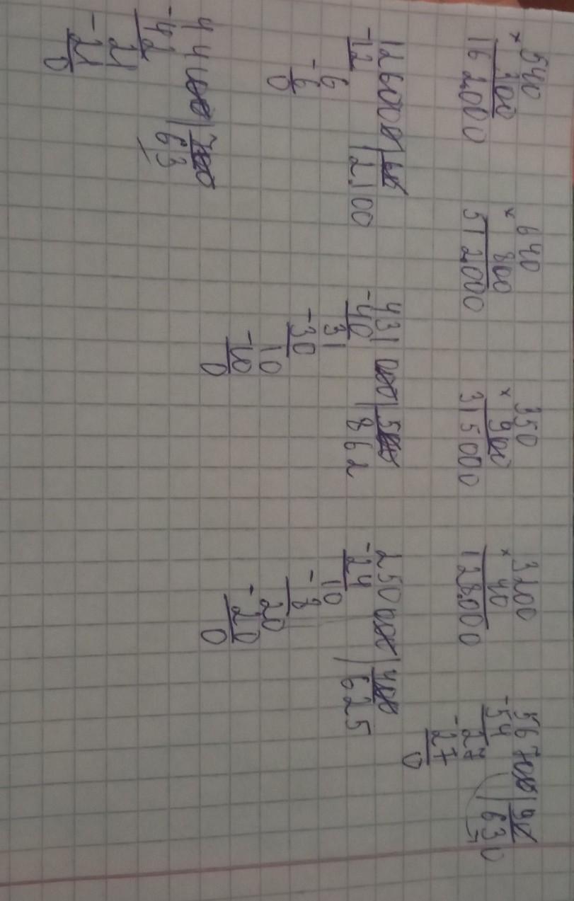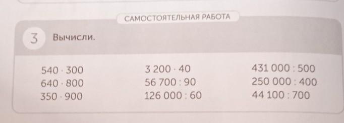 САМОСТОЯТЕЛЬНАЯ РАБОТА 3 Вычисли. 540 · 300 640 - 800 350.900 320040 56 700 : 90 126 000:60 431 000: 500 250 000 : 400 44 100: 700автомойка