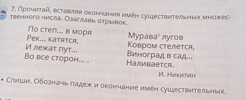 7. Прочитай, вставляя окончания имён существительных множес- твенного числа. Озаглавь отрывок. По степ... В моря Мурава“ лугов Рек... катятся, Ковром стелется, И лежат пут... Виноград в сад... Во все сторон.... Наливается. И. Никитин • Спиши. Обозначь падеж и окончание имён существительных.