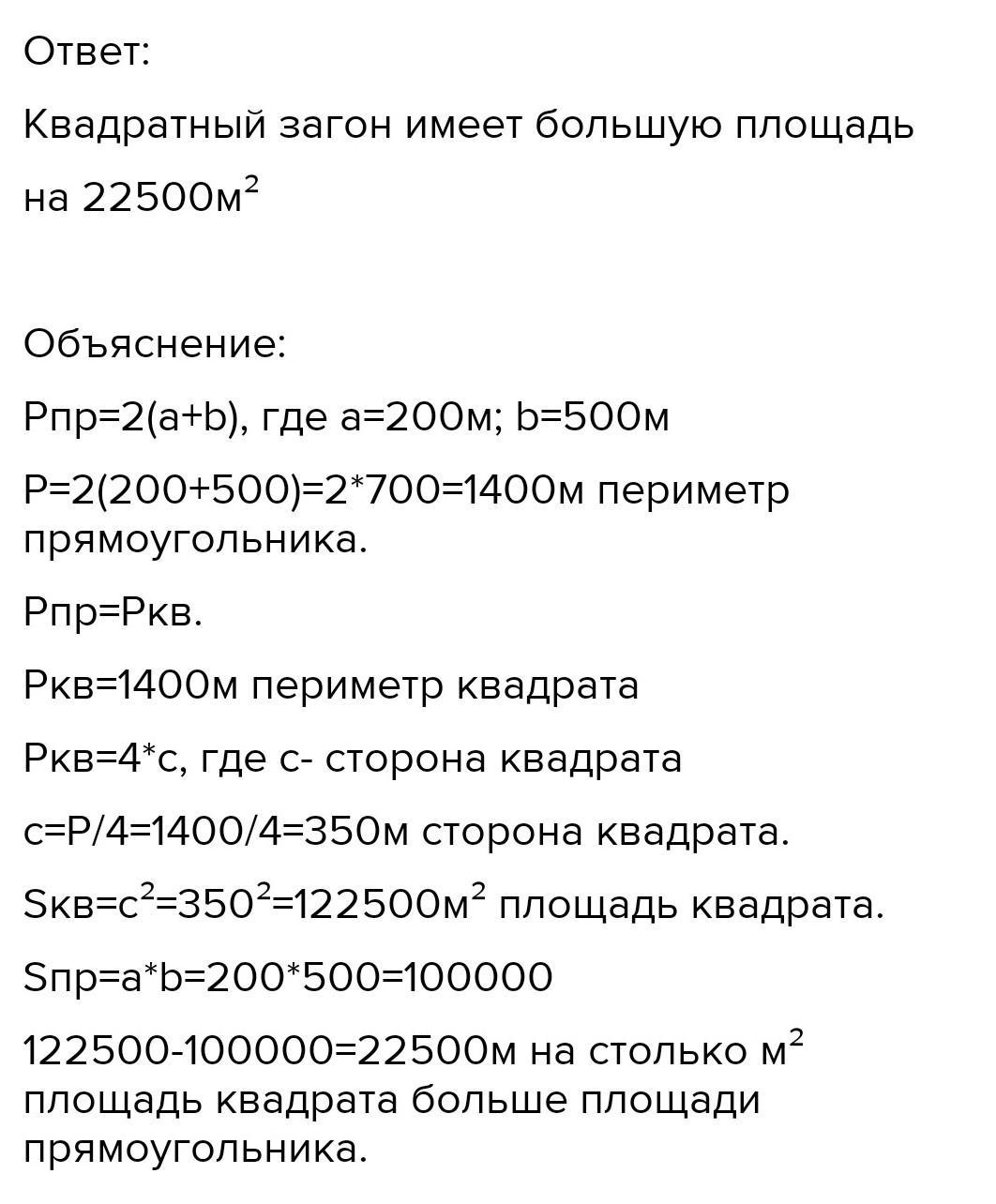 Тимофей огородил два загона для коз. Оказалось, что для каждого загона понадобилось одинаковое количество метров ограждения. Первый загон прямоугольный со сторонами 180 м и 260 м, а второй — квадратный. Какой загон имеет большую площадь? Загон квадратной формы Загон прямоугольной формы На сколько квадратных метров больше?