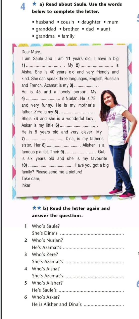 I am Saule and i am 11 years old. I have a big family. My mum is Aisha. She is 40 years old and very friendly and kind. She can speak three languages, English, Russian and French. Azamat is my dad. He is 45 and a lovely person. My granddad is Nurlan. He is 78 and very funny. He is my mother's father. Zere is my grandma. She's 76 and she is a wonderful lady. Askar is my little brother. He is 5 years old and very clever. My aunt, Dina, is my father's sister. Her husband, Alisher, is a famous pianist. Their daughter, Gul, is six years old and she is my favourite cousin. Have you got a big family? Please send me a picture!