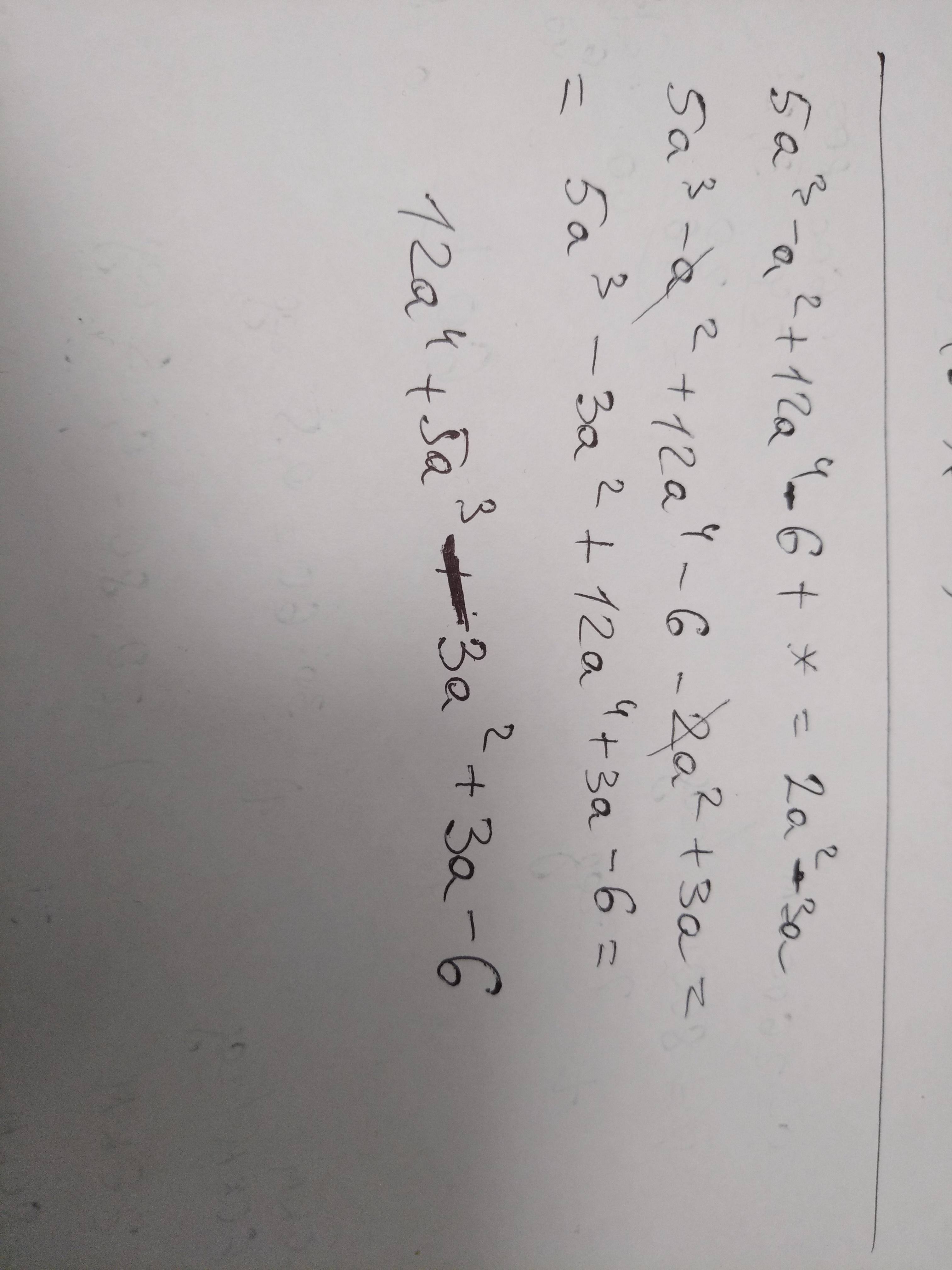 Поставьте многочлен вместо звездочки так чтобы получилось тождество 5a³-a²+12a⁴-6+(*)=2a²-3a пожалуйста,я контрольную по алгебре решаю