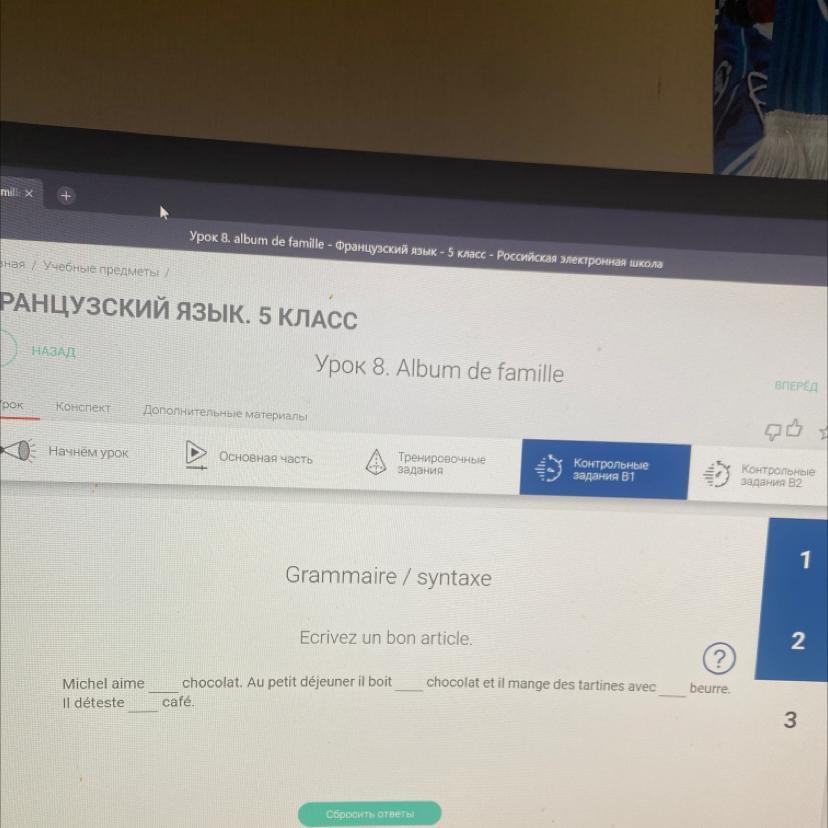 Michel aime le chocolat. Au petit déjeuner il boit du chocolat et il mange des tartines avec du beurre. Il déteste le café.