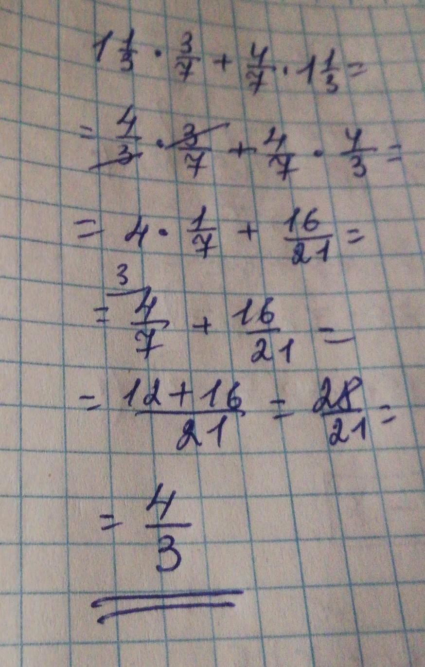 1 1/3 * 3/7 + 4/7 * 1 1/3 = 1 1/3(3/7 + 4/7) = 1 1/3* 7/7= 1 1/3 * 1 = 1 1/3 = 4/3.