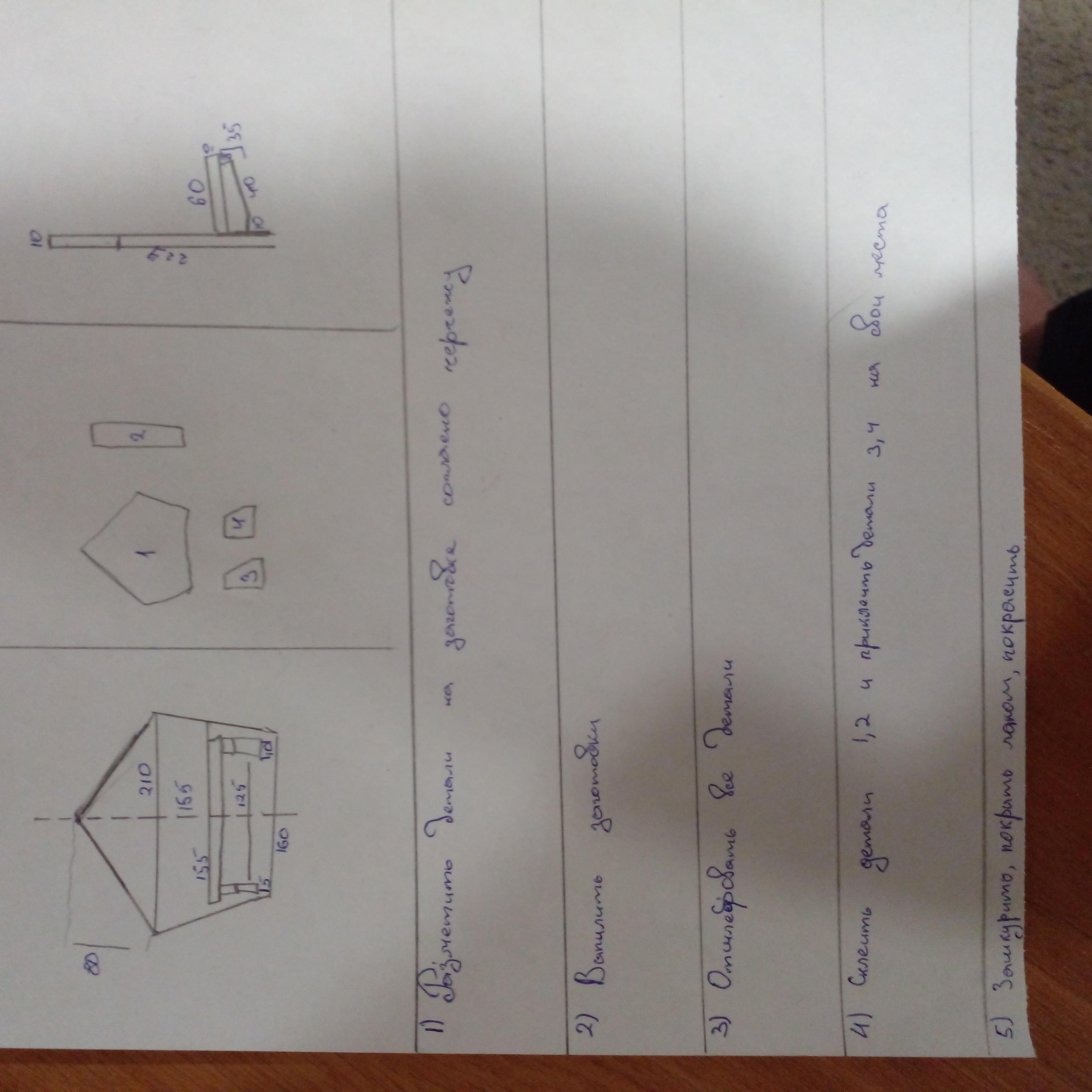 Под каждым действием сделай его описание. Типо, вырезать используя ручной лобзик, разметить на листе фанеры размером 400 на 400 ( можешь посчитать в принципе сколько точно надо) отшлефовать исмользуя среднего размера наждачку, напильник или еще что-то, склеить клеем по дереву, покрыть защитным лаком лаком, покрасить гуашью и т.д