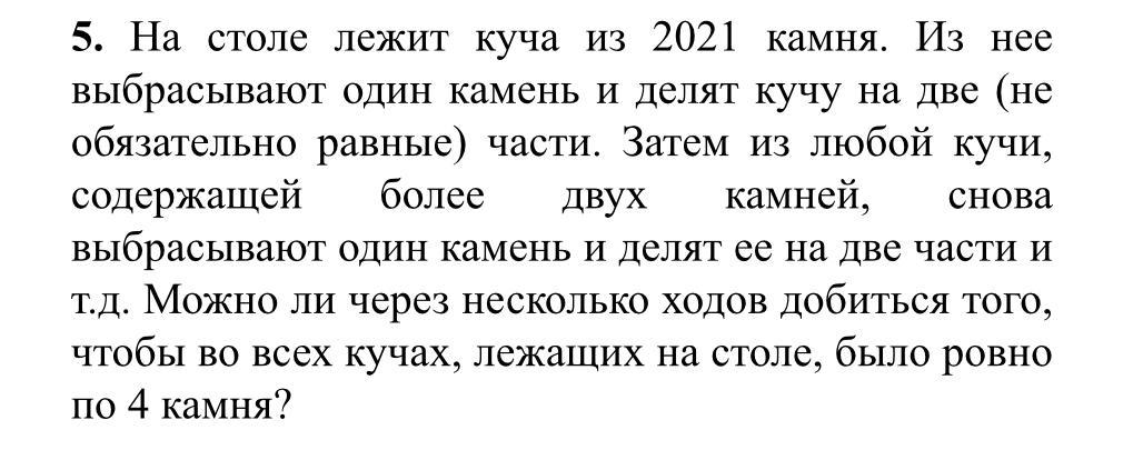 Если во ВСЕХ кучах, то нет. Так как будет не четное число камней (2021 не четное) в одной куче. Легкое решение)