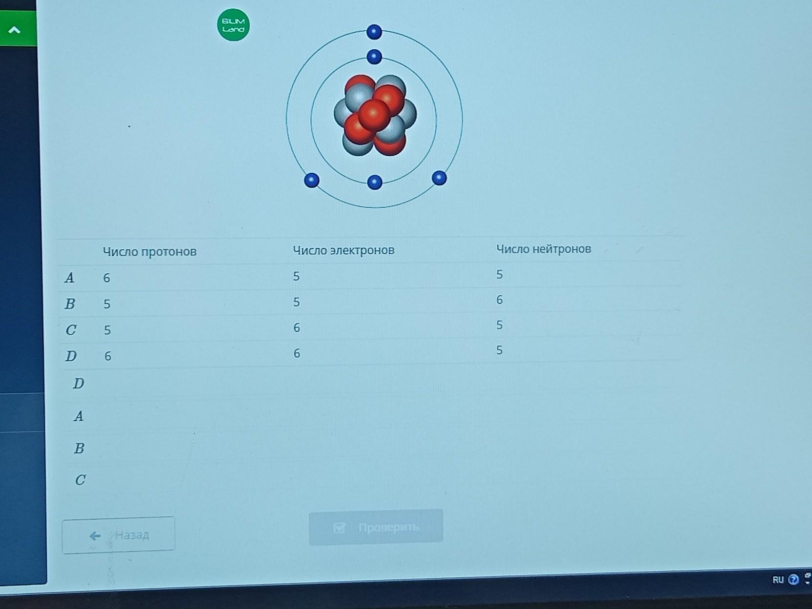 изучи изображение атома бора. Выбери строку, в которой верно указан состав атома бора
