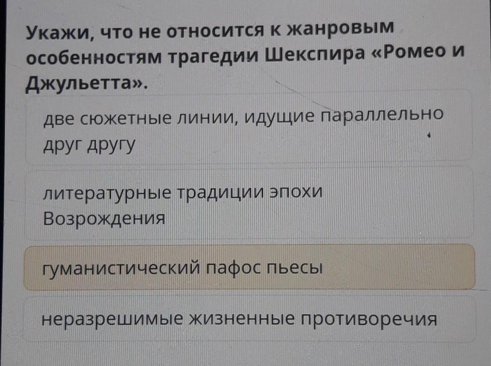 Укажи, что не относится к жанровым особенностям трагедии Шекспира «Ромео и Джульетта».