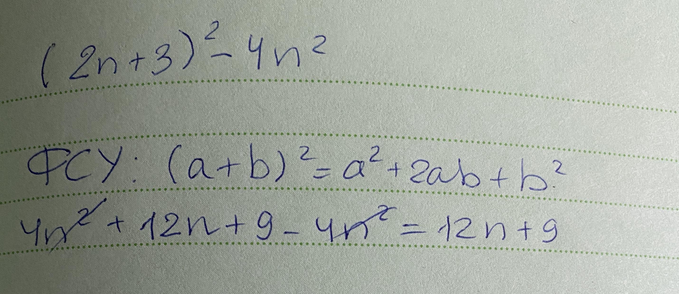 (2n + 3)² - 4n² = 4n² + 12n + 9 - 4n² = 12n + 9