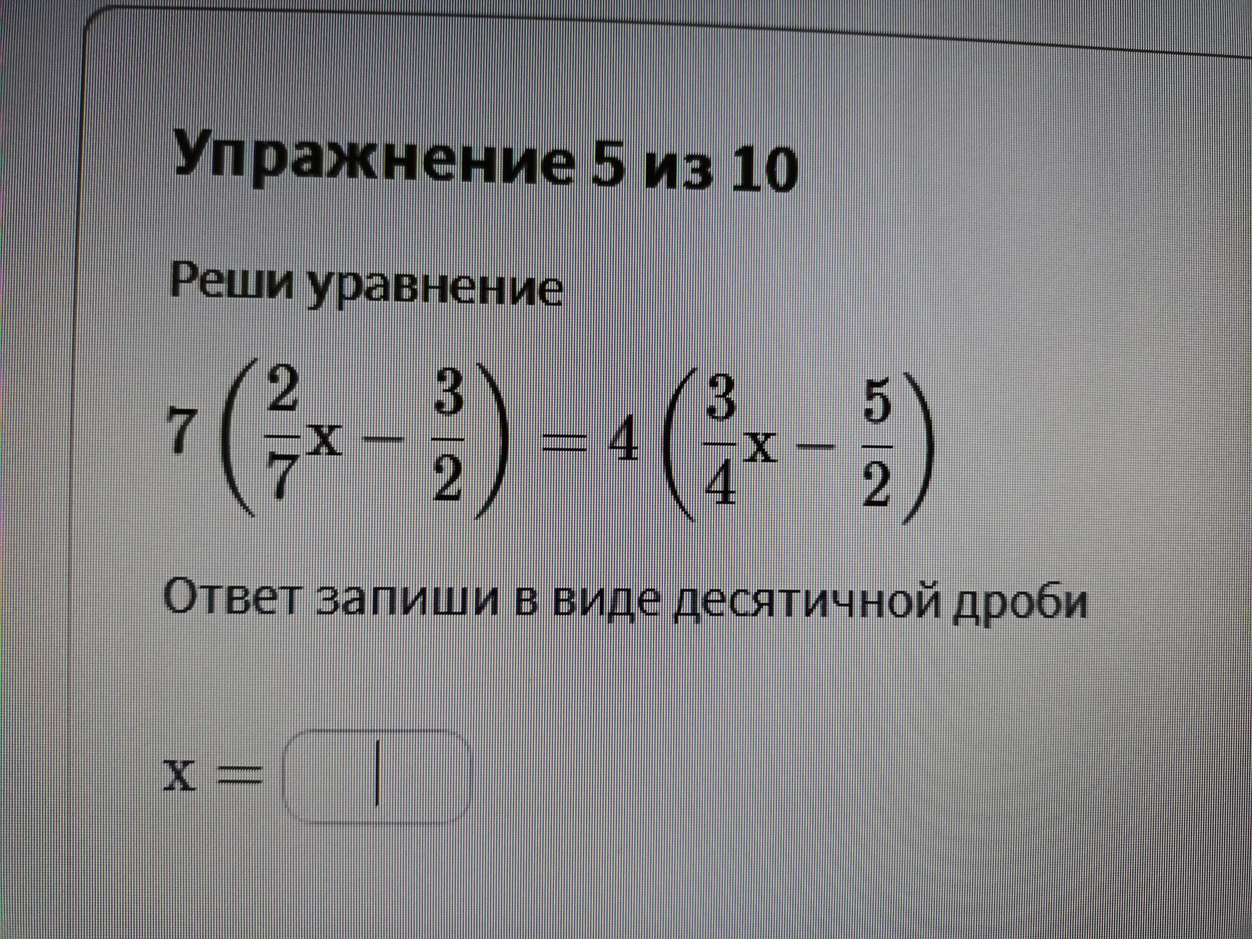 5 . 7(2/7 x - 3/2 ) = 4( 3/4 x - 5/2 ) ;
