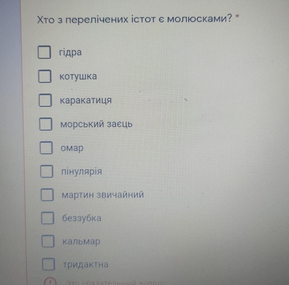 Ответ: Котушка, каракатиця, морський заєць, беззубка, кальмар, тридактна
