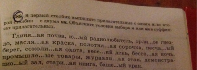 Глиняная(суф. -ин) почва, юный(основа на н) радиолюбитель, орлиное(суф. -ин) гнездо, масляная(суф. -ян) краска, полотняная(суф. -ян) сорочка, песчаный(суф. -ан) берег, соколиная(суф. -ан) охота, весенний(основа на н) день, бессонная(приставка) ночь, промышленные(суф. -енн) товары, журавлиная(суф. -ин) стая, демонстрационный (суф. -онн) зал, старинная(основа на н) книга, башенный(суф. -енн) кран.