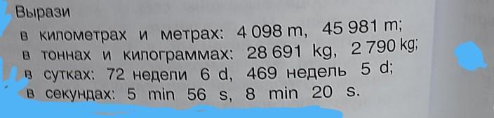 в километрах и метрах: 4 098 m, 45 981 m, в тоннах и килограммах: 28 691 kg. 2 790 kg в сутках: 72 недели 6а, 469 недель , в секундах: 5 min 56 s, 8 min 20 s.