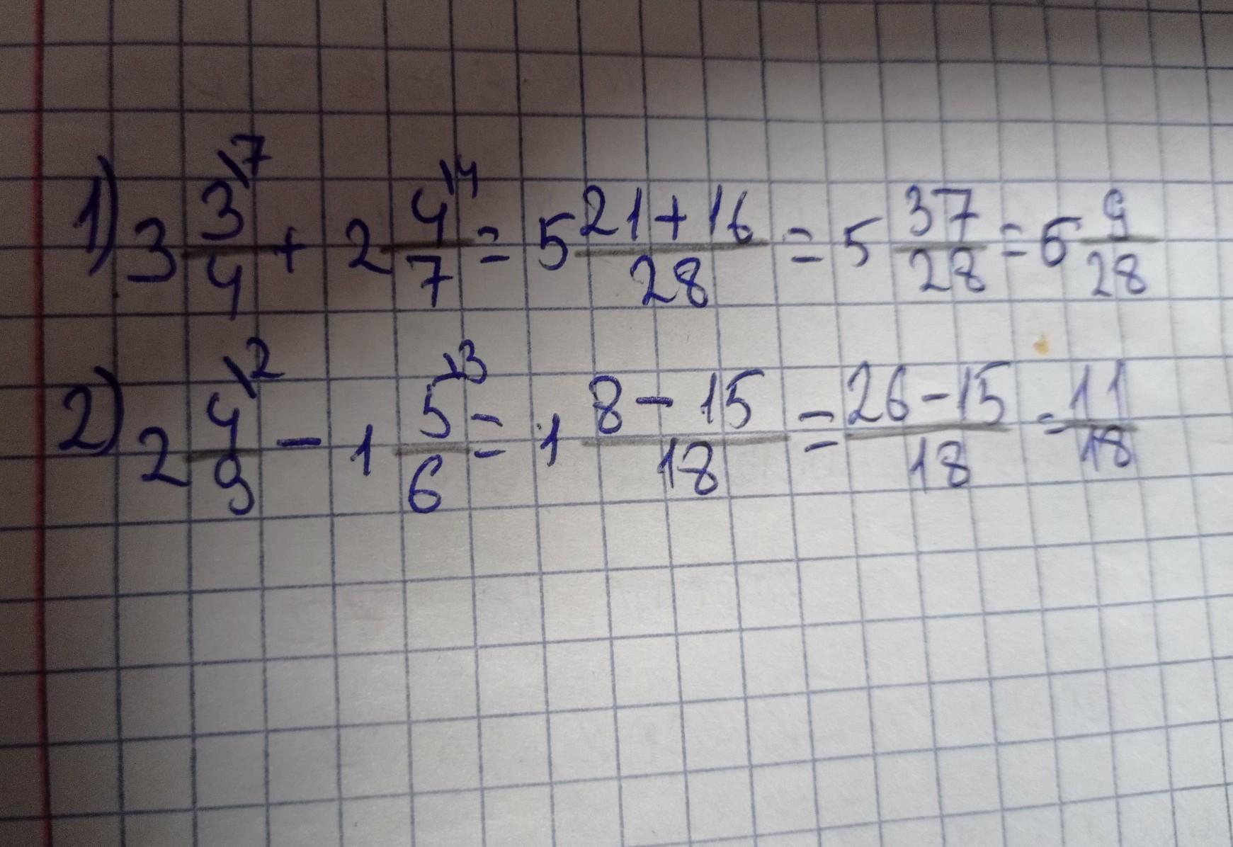 1. Найдите значение выражения 3целых три четвёртых+2целых четыре седьмых помогите решить и 2целых четыре девятых-1целая пять шестых
