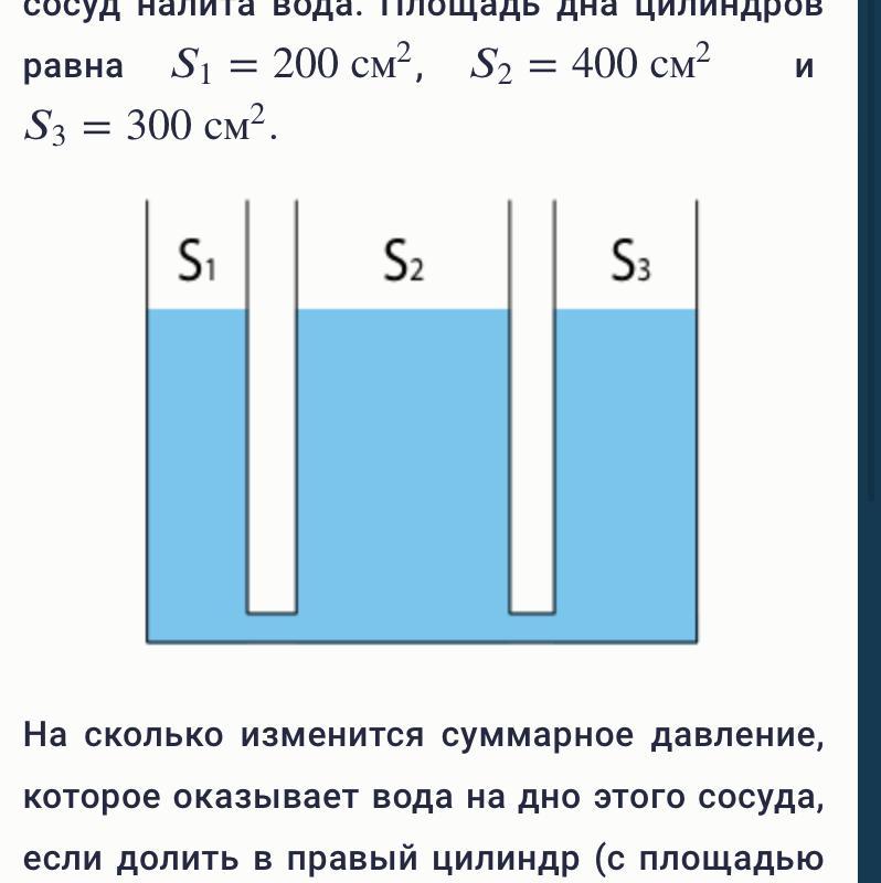 На сколько изменится суммарное давление, которое оказывает вода на дно этого сосуда, если долить в правый цилиндр (с площадью дна 3
