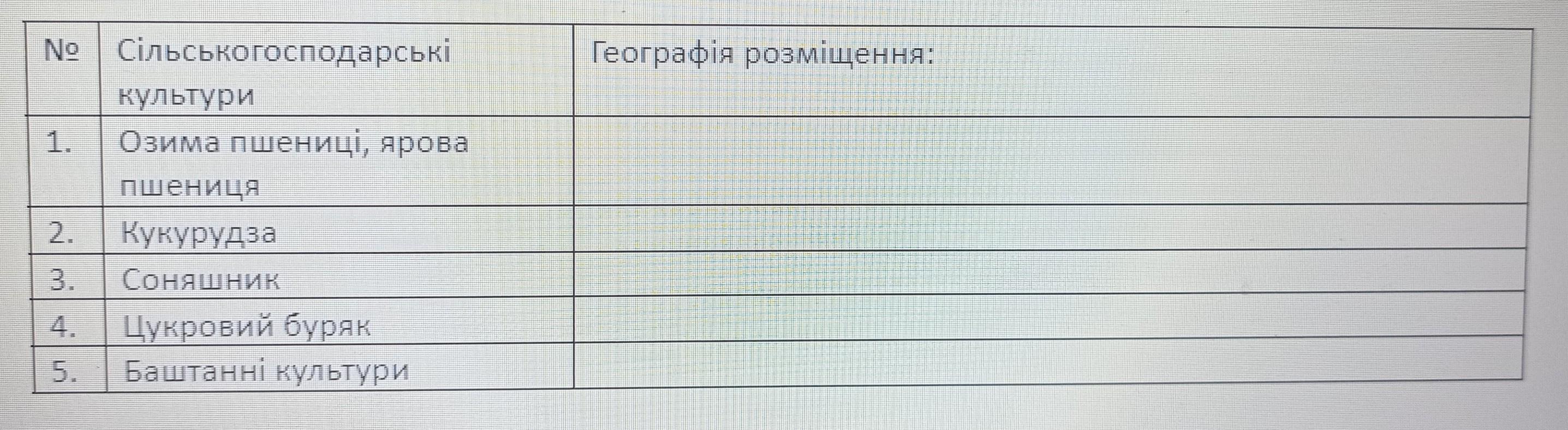 Найважливіші сільськогосподарські культури України – це озима пшениця, кукурудза, соняшник, соя, ячмінь, картопля, ріпак, цукровий буряк.