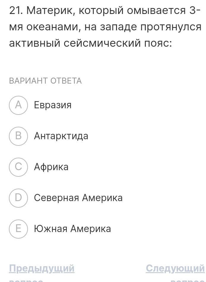 Материк, который омывается 3 мя океанами, на западе протянулся активный сейсмический пояс: ВАРИАНТ ОТВЕТА A Евразия Антарктида Африка Северная Америка Южная Америка