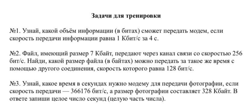 Найдем время, за которое файл передался по первому соединению. По формуле Время = Объем / Скорость получаем Время = 56000 / 256 = 218,75 с. Чтобы найти объем файла, который можно передать за то же время с другого соединения, используем формулу из первого задания. Объем = 128 * 218,75 = 28000 бит = 3500 байт.