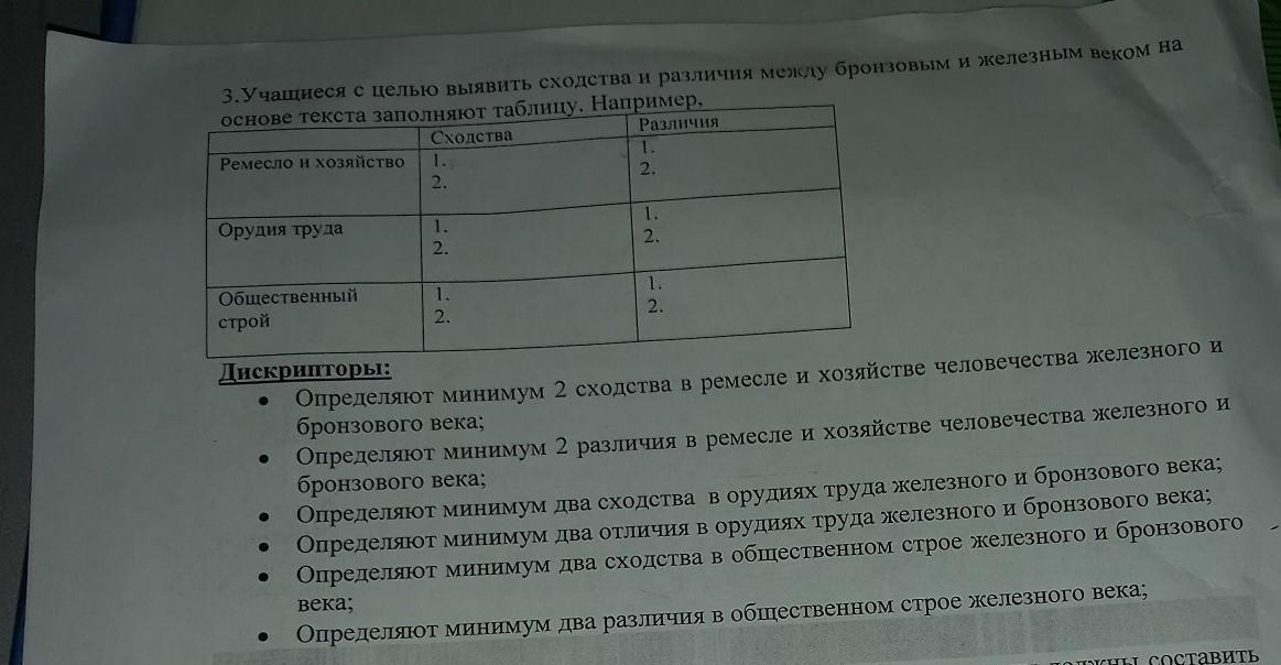 3. Учащиеся с целью выявить сходства и различия между бронзовым и железным веком на основе текста заполняют таблицу. Например, Сходства Различия Ремесю и хозяйство 1. 2. 1 2. Орудия труда 1. 2 1. 2. Общественный строй 1. 2. 1. 2. Дискрипторы: Определяют минимум 2 сходства в ремесле и хозяйстве человечества железного и бронзового века; Определяют минимум 2 различия в ремесле и хозяйстве человечества железного и бронзового века; Определяют минимум два сходства в орудиях труда железного и бронзового века; Определяют минимум два отличия в орудиях труда железного и бронзового века; Определяют минимум два сходства в общественном строе железного и бронзового . века; Определяют минимум два различия в общественном строе железного века;