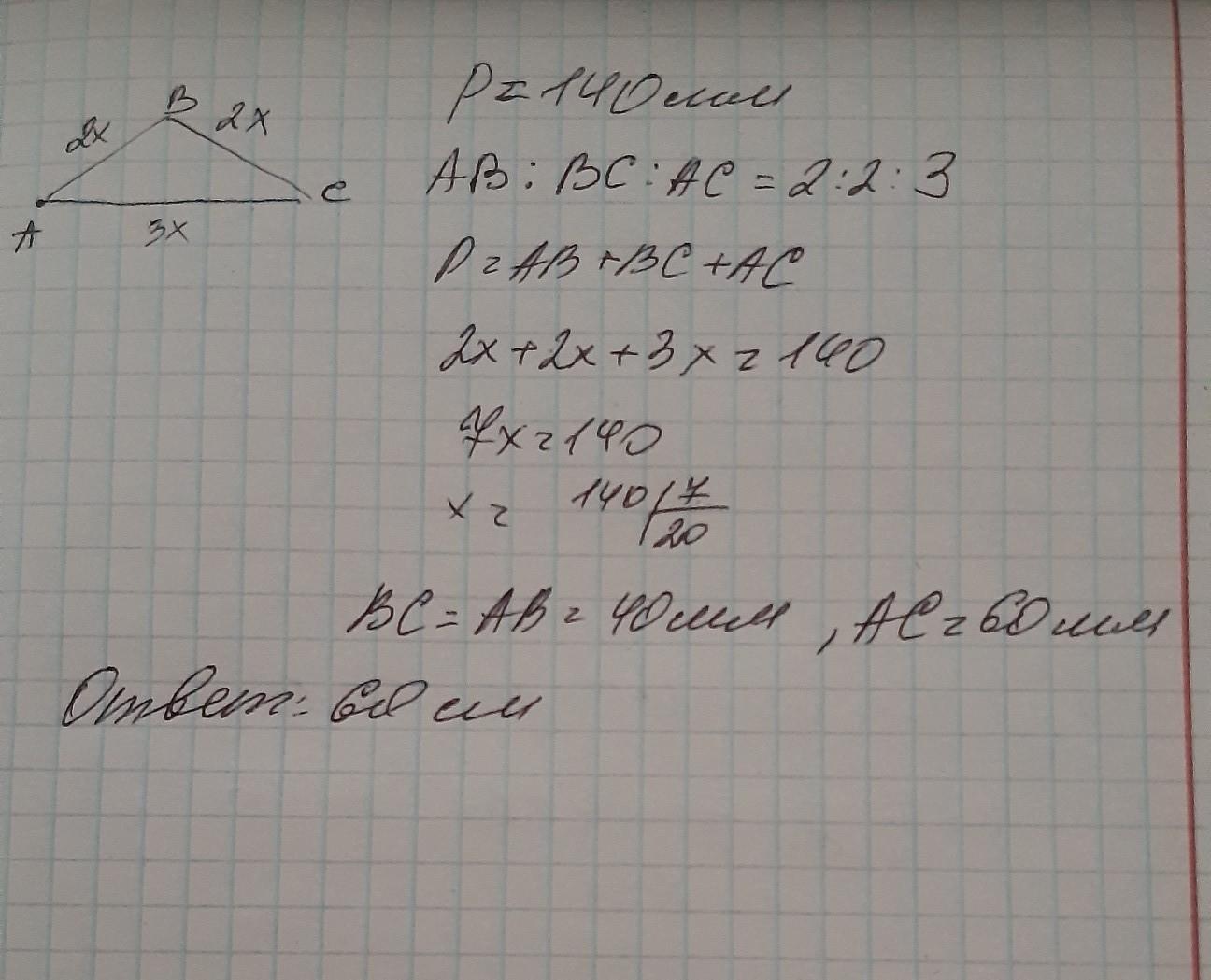 Найдите наибольшую сторону треугольника (в мм), если они относятся как 2:2:3, а периметр треугольника равен 140 мм.