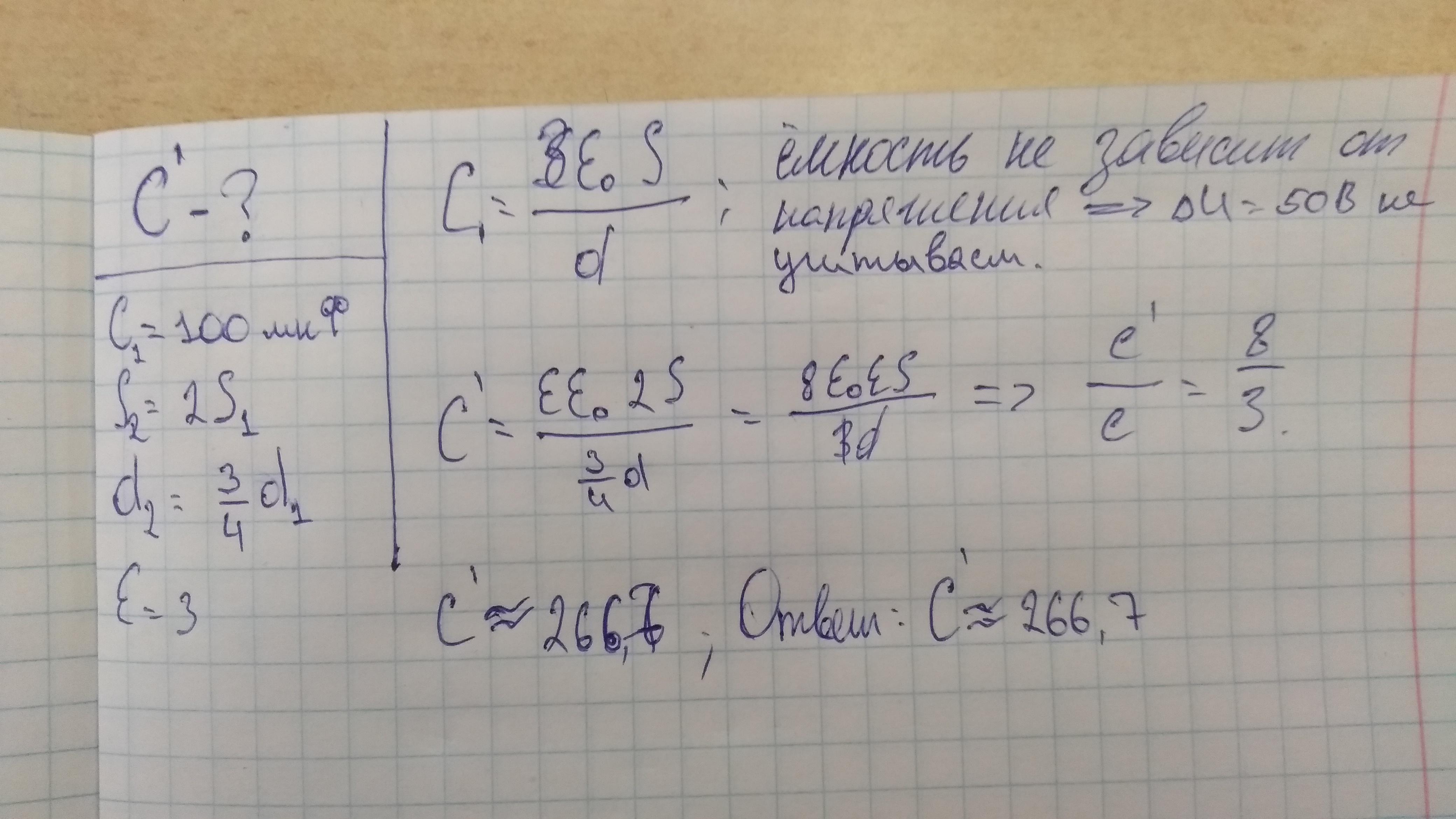 Ёмкость плоского воздушного конденсатора 100 мкФ. Какой станет ёмкость конденсатора, если площадь его пластин увеличить в 2 раза, расстояние между пластинами уменьшить на 25% напряжение, подаваемое на обкладки, увеличить на 50 В? При этом пространство между обкладками заполняется маслом, у которого диэлектрическая проницаемость ε=3