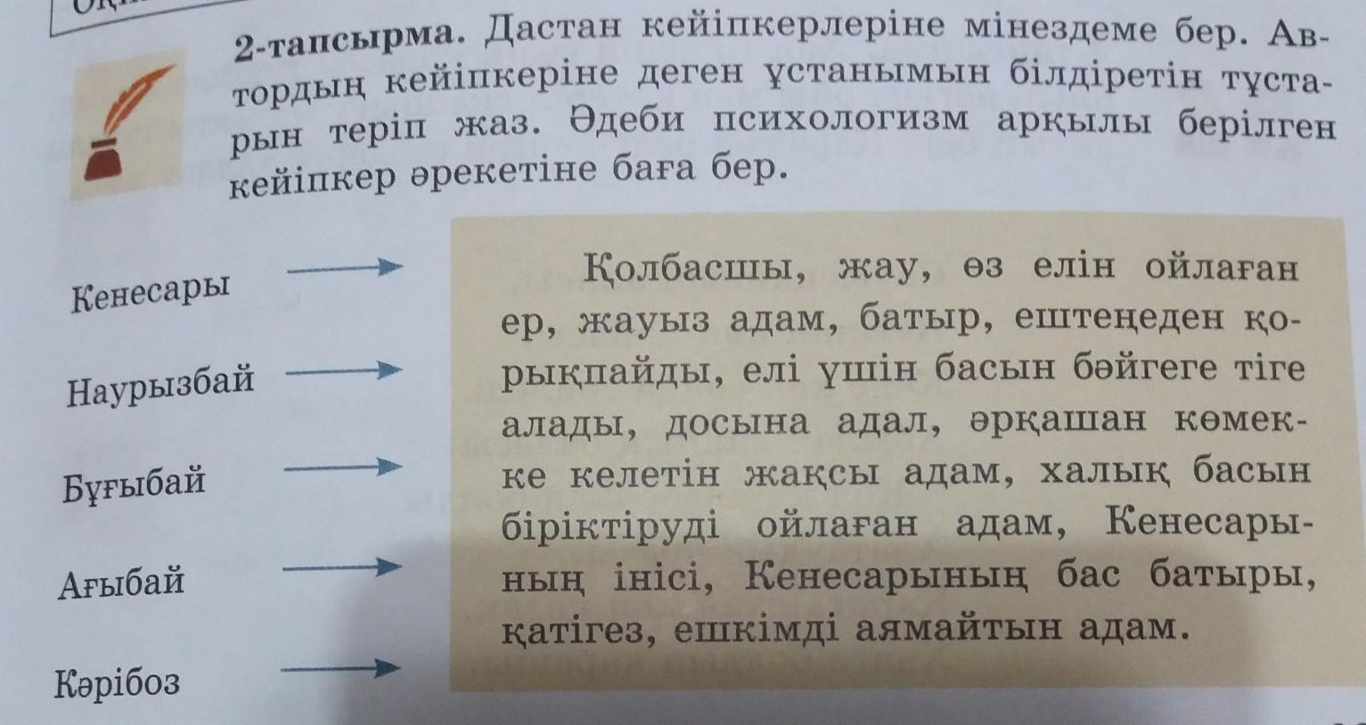 2-тапсырма. Дастан кейіпкерлеріне мінездеме бер. Автордың кейіпкеріне деген ұстанымын білдіретін тұста- рын теріп жаз. Әдеби психологизм арқылы берілген кейіпкер әрекетіне баға бер.
