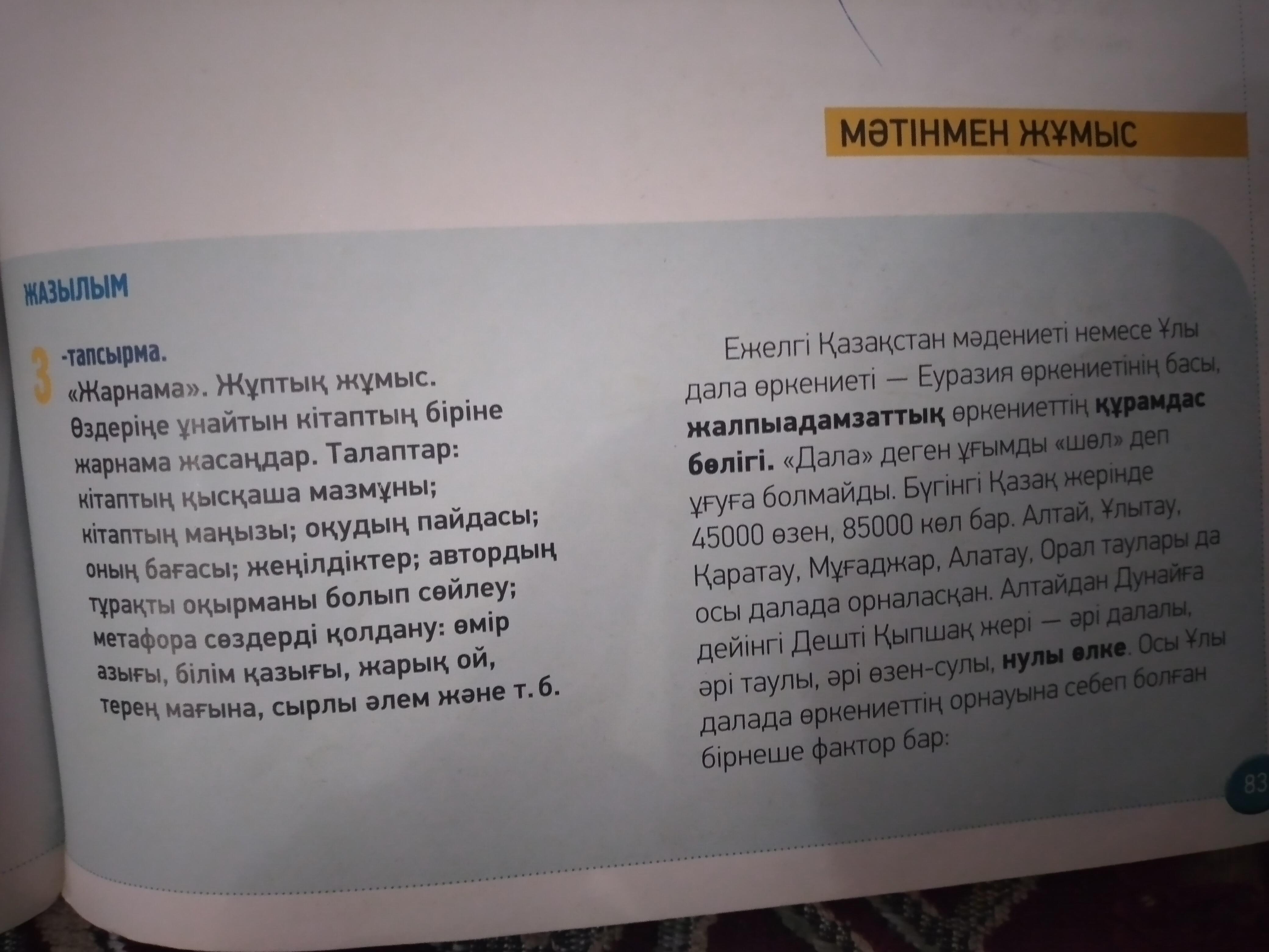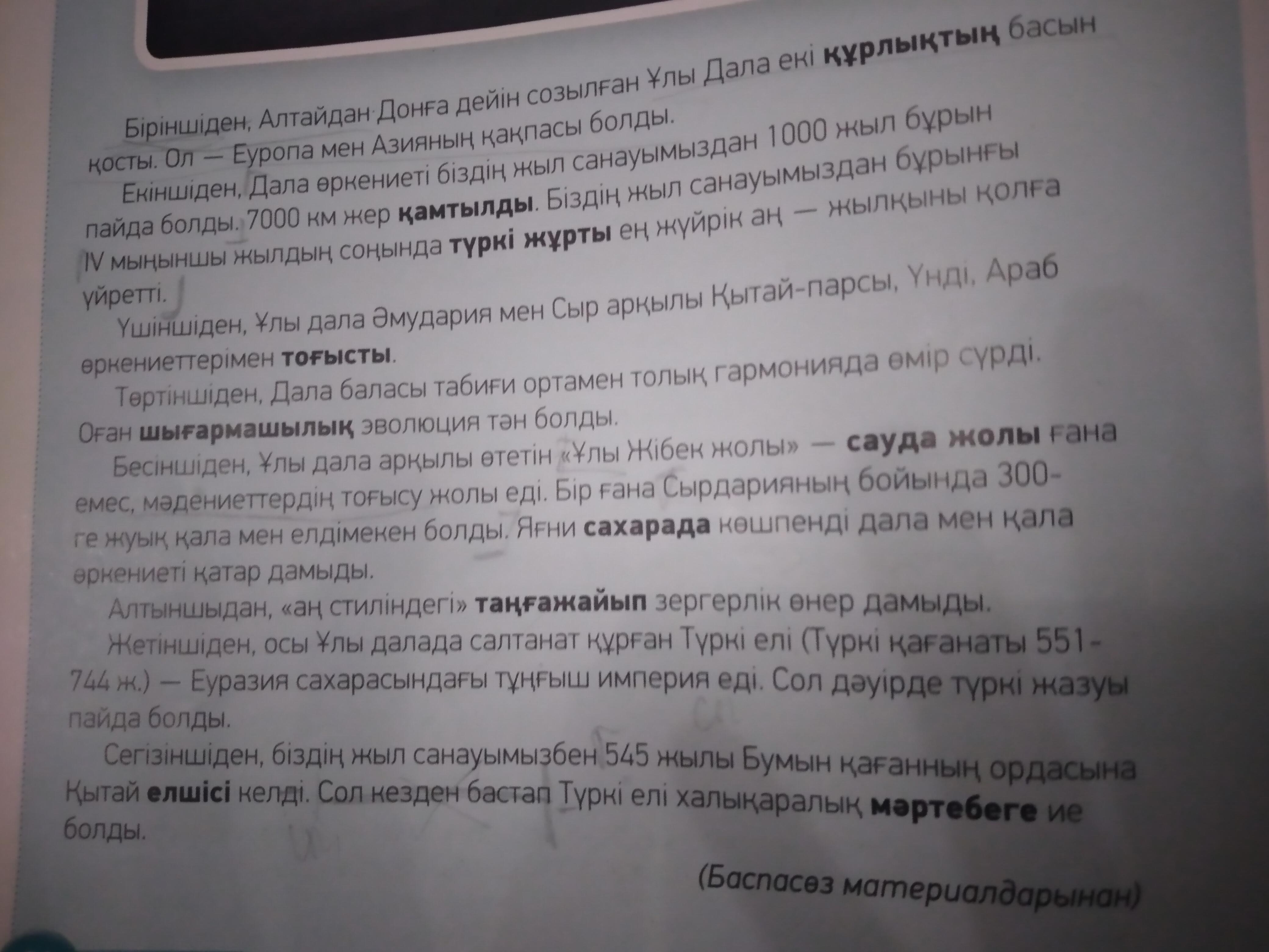 -Қазақстан тарихы тереңде жатқан ел. Ежелгі Қазақстанды Ұлы дала өркениеті деп атауға болады. Қазіргі таңда Қазақстанда 45000 өзен және 85000 көл бар. Және Қазақстанда тарихи,ежелгі таулар бар. Біздың "Ұлы даламыз" екі құрлықтын басын қосқан жер.