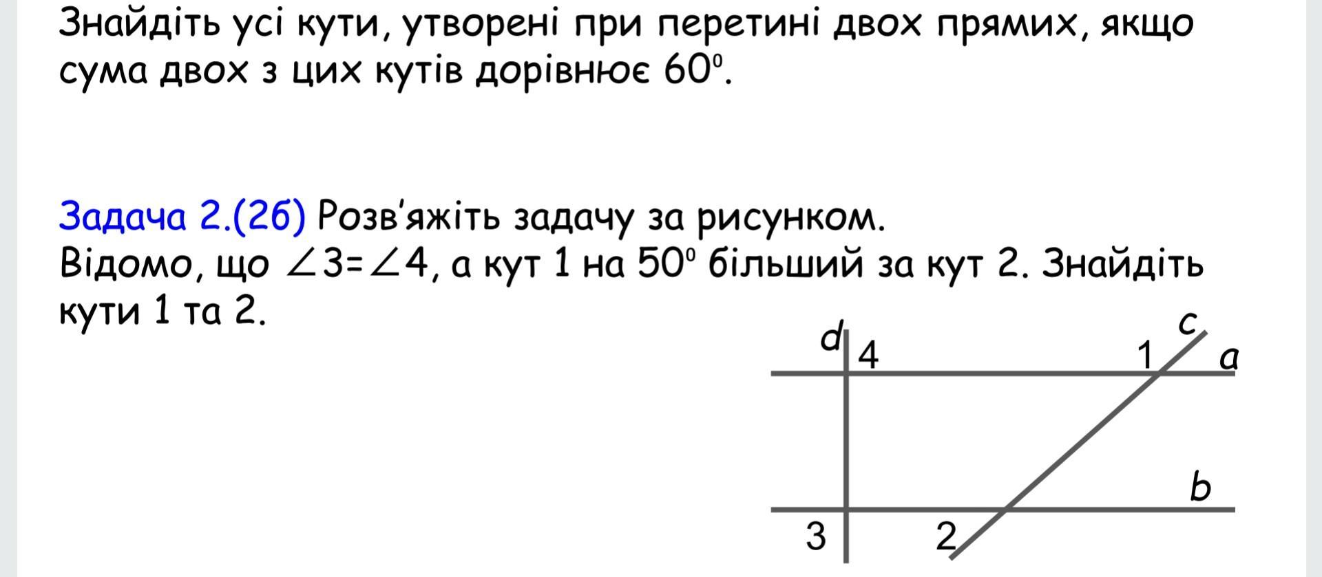 Нехай ∠1 = х см, тоді ∠2 = (х+50) см. Складемо і розв'яжемо таке рівняння: