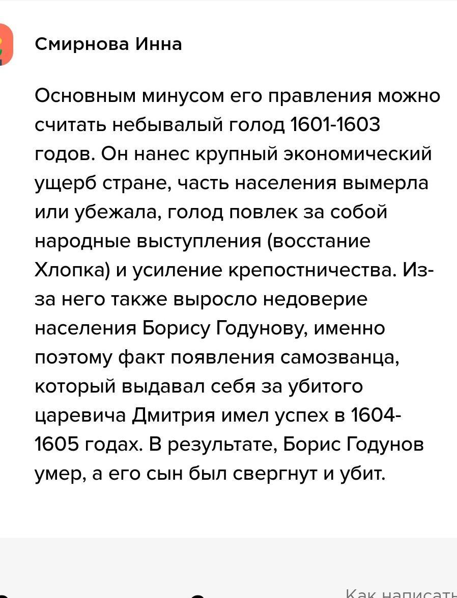 Основным минусом его правления можно считать небывалый голод 1601-1603 годов. Он нанес крупный экономический ущерб стране, часть населения вымерла или убежала, голод повлек за собой народные выступления (восстание Хлопка) и усиление крепостничества. Из-за него также выросло недоверие населения Борису Годунову, именно поэтому факт появления самозванца, который выдавал себя за убитого царевича Дмитрия имел успех в 1604-1605 годах. В результате, Борис Годунов умер, а его сын был свергнут и убит.