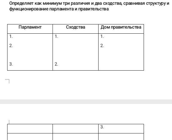 Определяет как минимум три различия и два сходства, сравнивая структуру и функционирование парламента и правительства