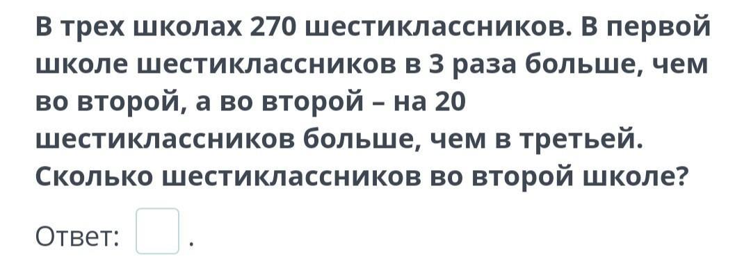 В трех школах 270 шестиклассников. В первой школе шестиклассников в 3 раза больше, чем во второй, а во второй – на 20 шестиклассников больше, чем в третьей. Сколько шестиклассников во второй школе?