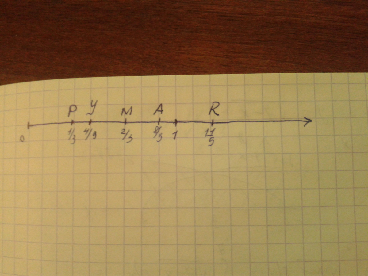 Примите за единичный отрезок длину 9 клеток тетради и отметьте на координатном луче точки (Y 4/9) (P 1/3) (A 8/9) (M 2/3) (R 11/9)