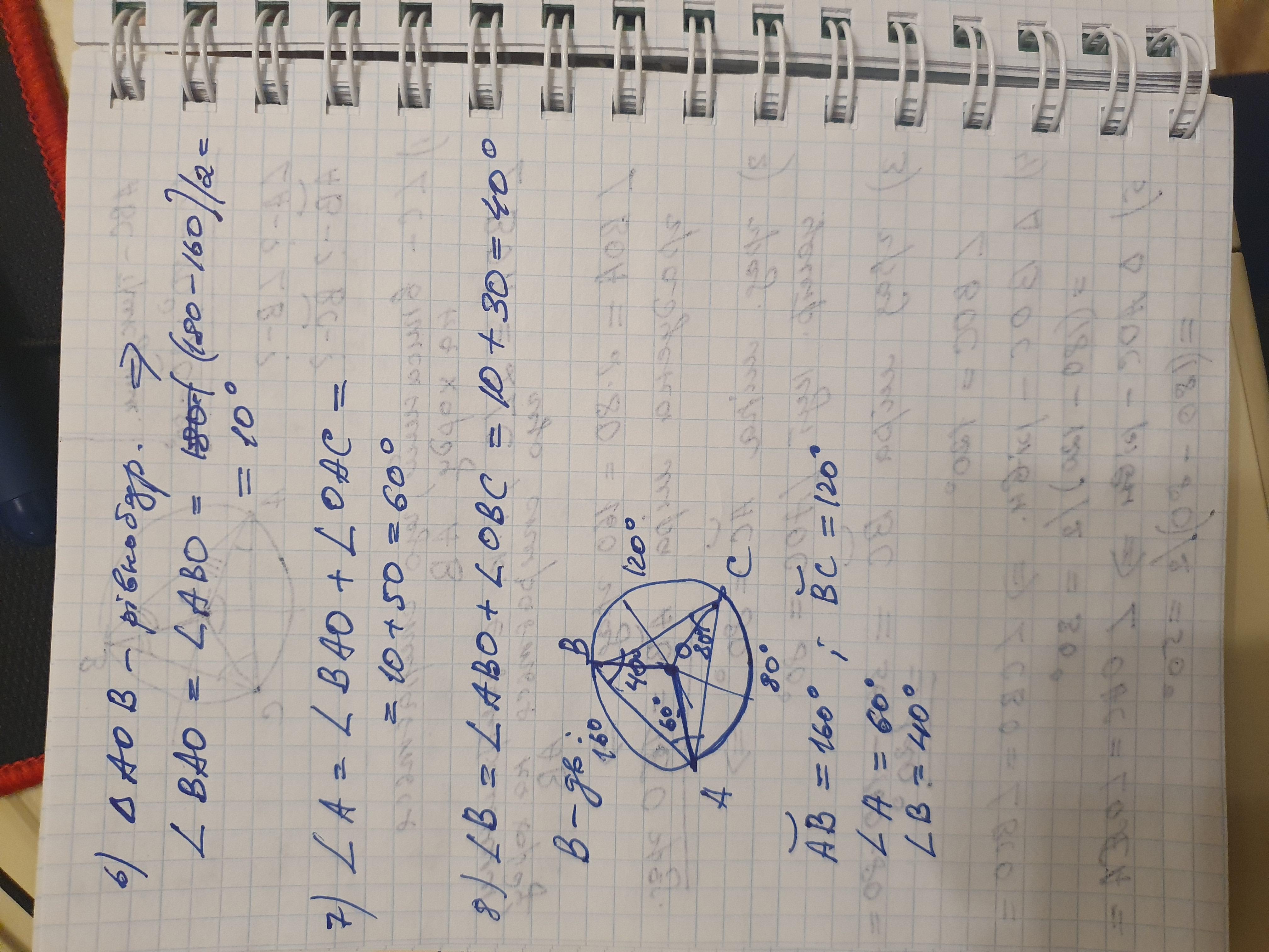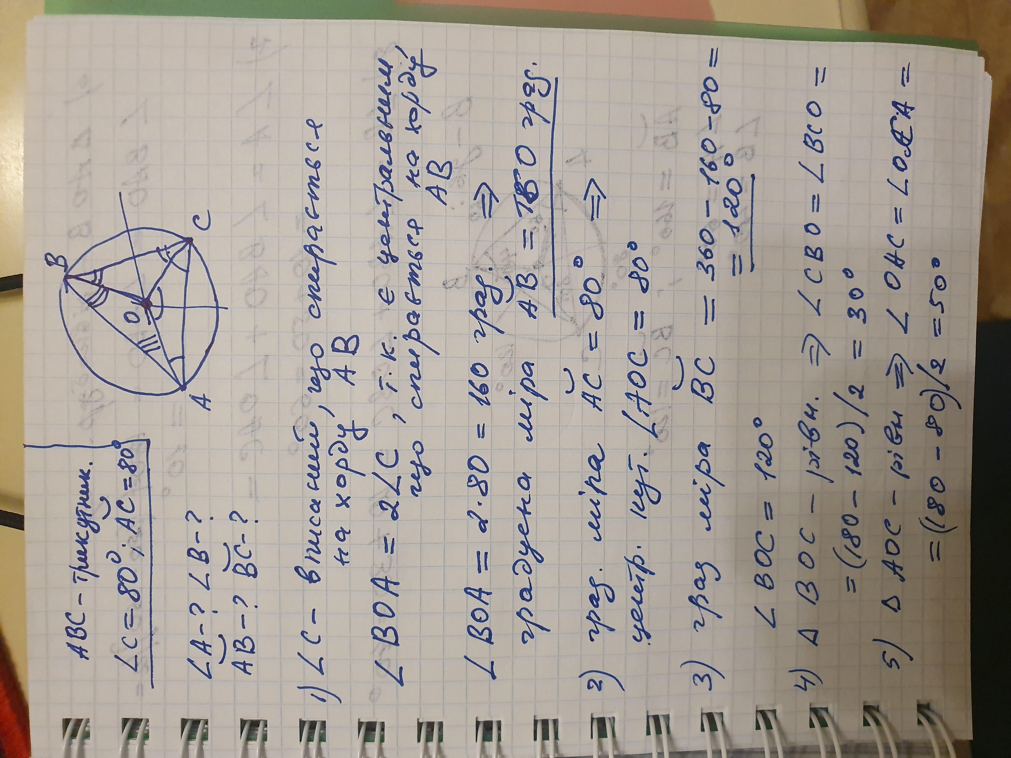 Трикутник АВС вписаного в коло, причому кут С = 80 градусів, дуга АС = 80 градусів. Знайти кут А і кут В та градусні міри дуг АВ і ВС