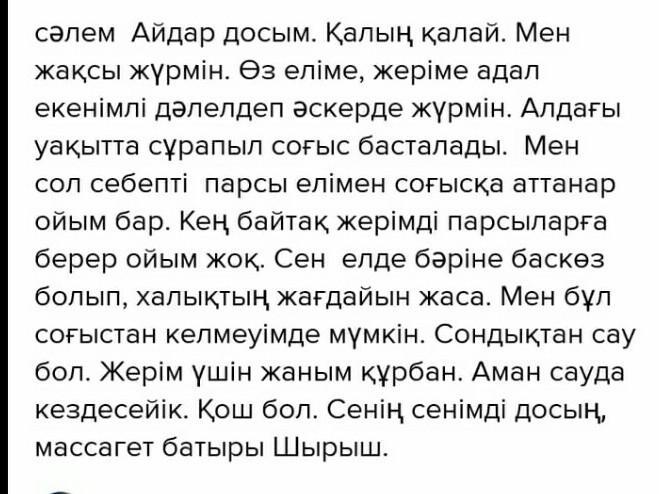ЖАЗЫЛЫМ АЙТЫЛЫМ 13-тапсырма. «Синектика». Өтілген дереккөздерден алынған ақпараттарға сүйене отырып, сақ жаугерінің атынан өзіңнің сыныптастарынарнап хат жаз. Хатта ерлік, елді қорғау туралы айтыл- сын. Хат мәтінінде екі мал-мәтел пай- далан. Жіктеу, сілтеу, сау есімдіктерін қолдан.