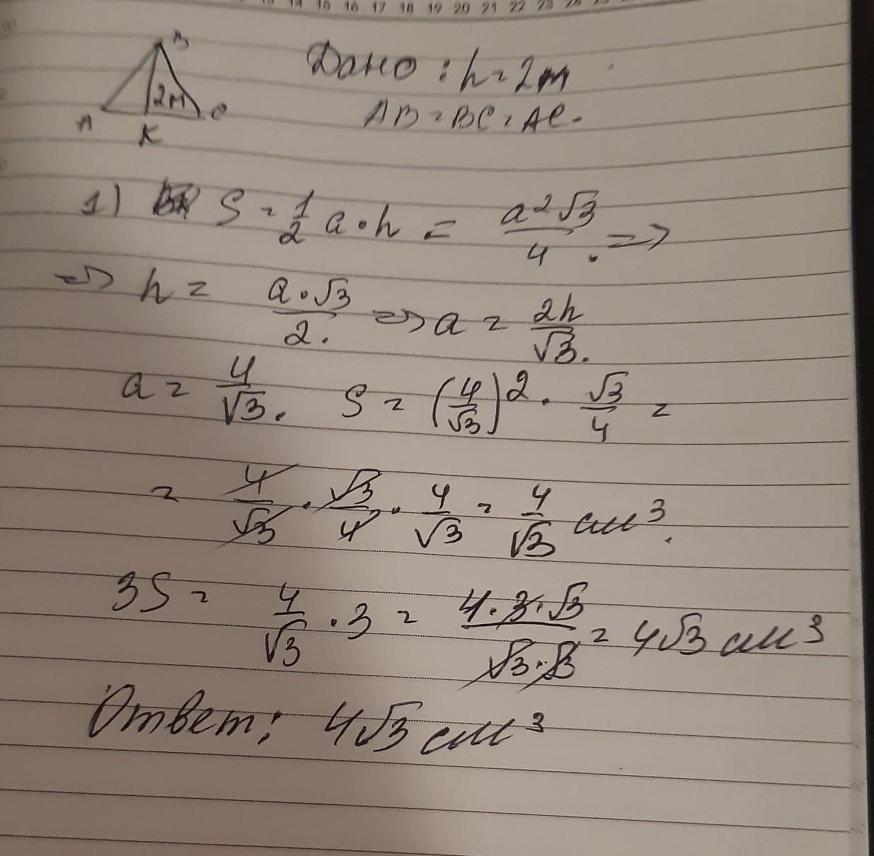 2.Коммунальным работникам на аллее необходимо разбить три одинаковых клумба, каждая из которых имеет форму равностороннего треугольника. Высота каждого треугольника равна 2 метрам. Какую площадь будут занимать клумбы?