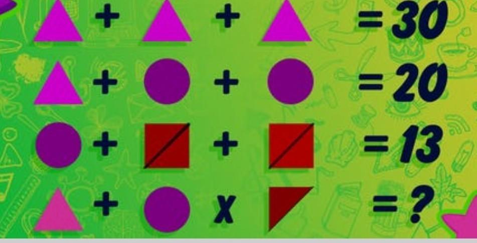 4)так как треугольник равен 10ти а круг 5ти складываем 10 и пять получается 15. Так как квадрат равен 4 а в примере половина квадрата делим 4 на 2 получается 2, а теперь умножаем сумму треугольника и круга (15) на 2 получается 30