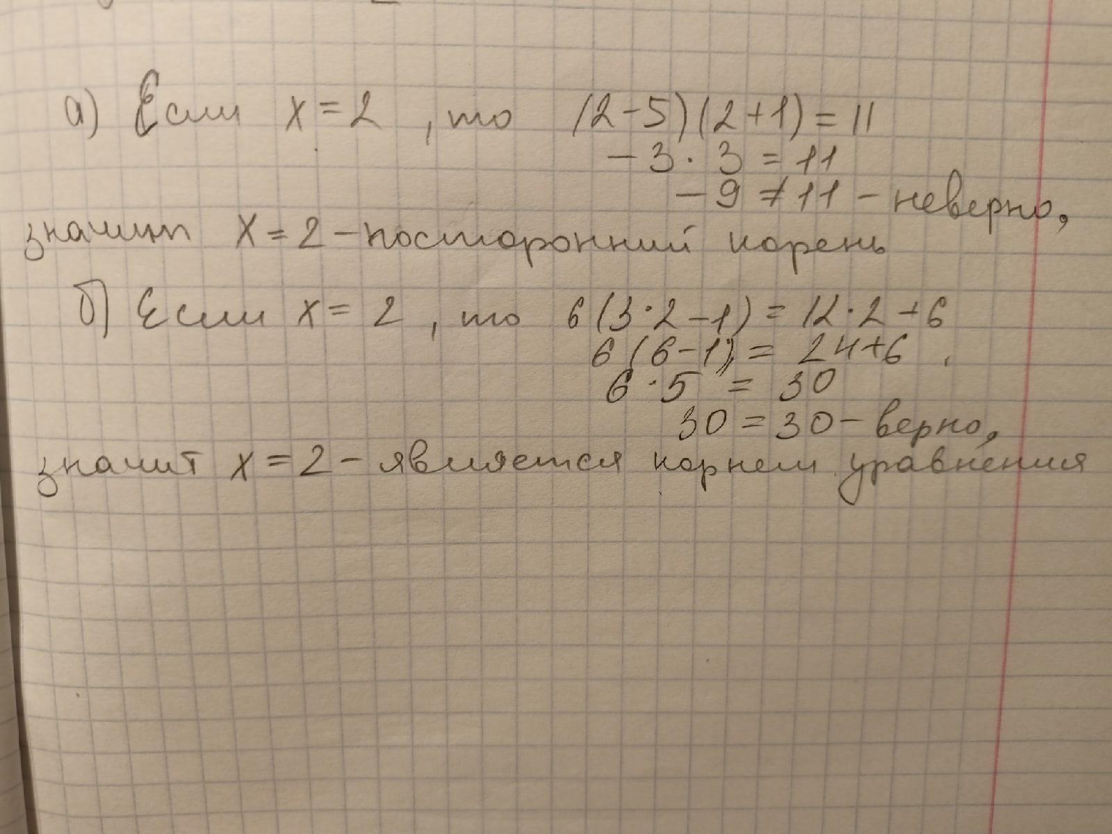 помогите решить.является ли число 2 корнем уравнения. а)(х-5)(х+1)=11 б)6(3х-1)=12х+6. нужно подставить число 2 в каждое уравнение вместо х,посмотреть обратиться ли уравнение в верное равенство или нет