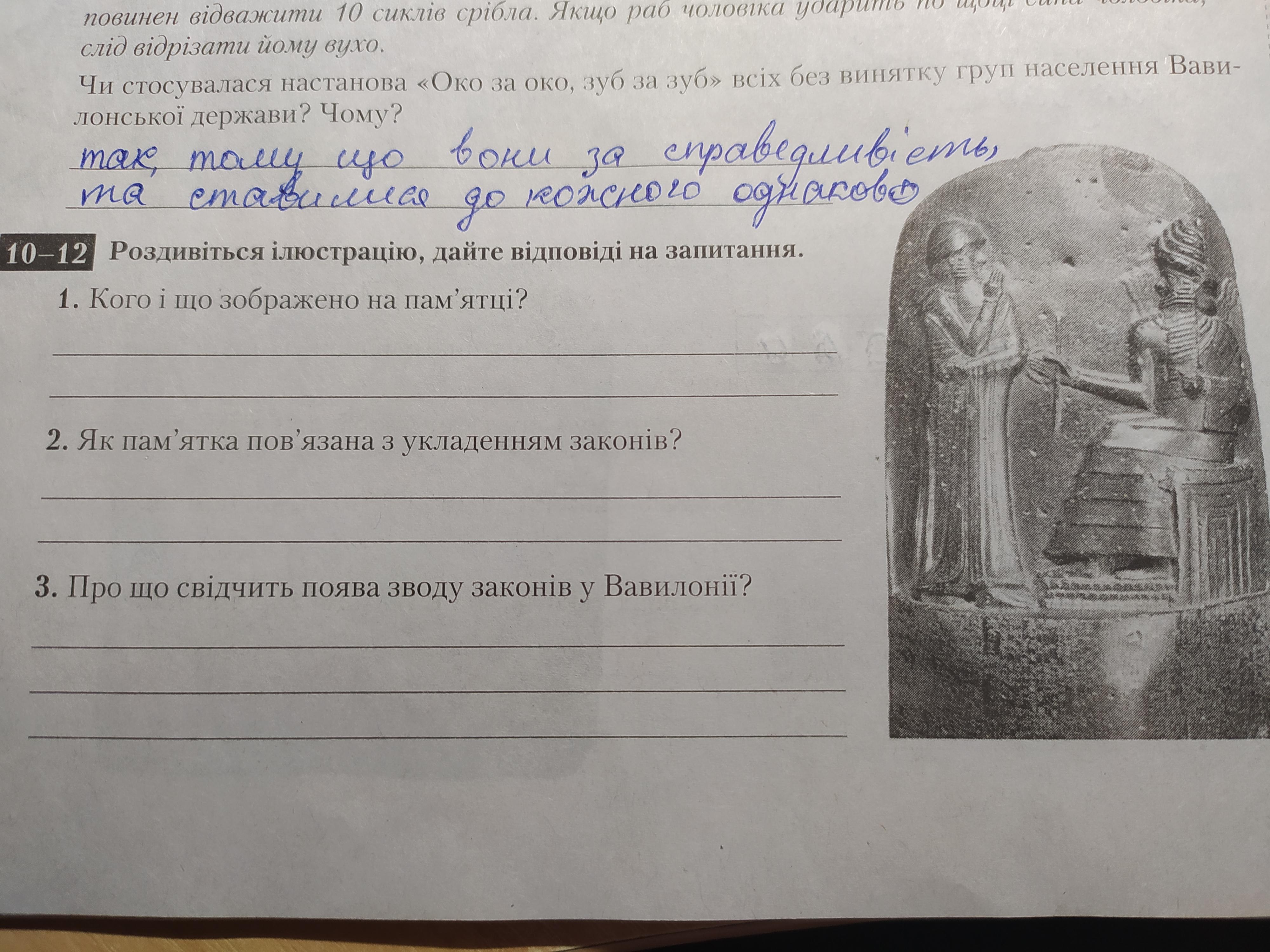 На зображенні стела з "Законами Хаммурапі". Це збірка законів вавілонського царя Хамиурапі, видана у 1750 році до н.е. Поява збірника свідчила про перехід до правових відносин у старовавілонській державі. А саме - чіткого визначення прав і обов'язків різних категорій населення.