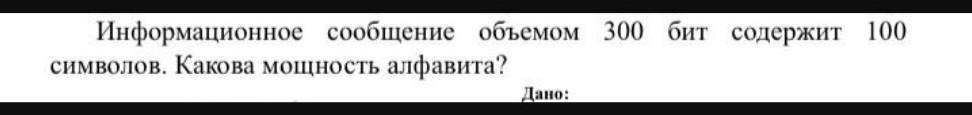 Чтобы найти мощность алфавита нам для начала нужна знать вес одного символа, его мы сможем из формулы для объёма информации (I = i * k), где I - информационный объем сообщения, i - вес одного символа, k - количество символов в сообщении