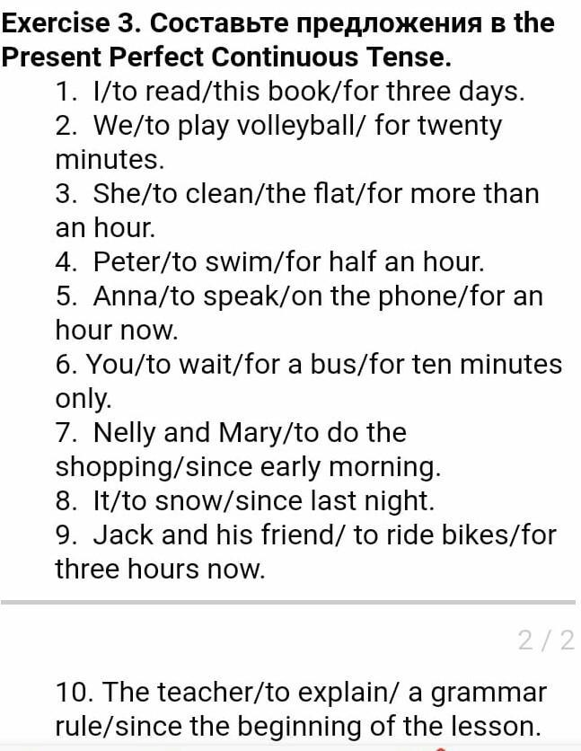 I have been reading this book for three days. We have been playing volleyball for twenty minutes. She has been cleaning the flat for more than an hour. Peter has been swiming for half an hour. Anna has been speaking on the phone for an hour now. You have been waiting for a bus for ten minutes only. Nelly and Mary have been doing the shopping since early morning. It has been snowing since last night. Jack and his friend have been riding bikes for three hours now. The teacher has been explaining a grammar rule since the beginning of the lesson.