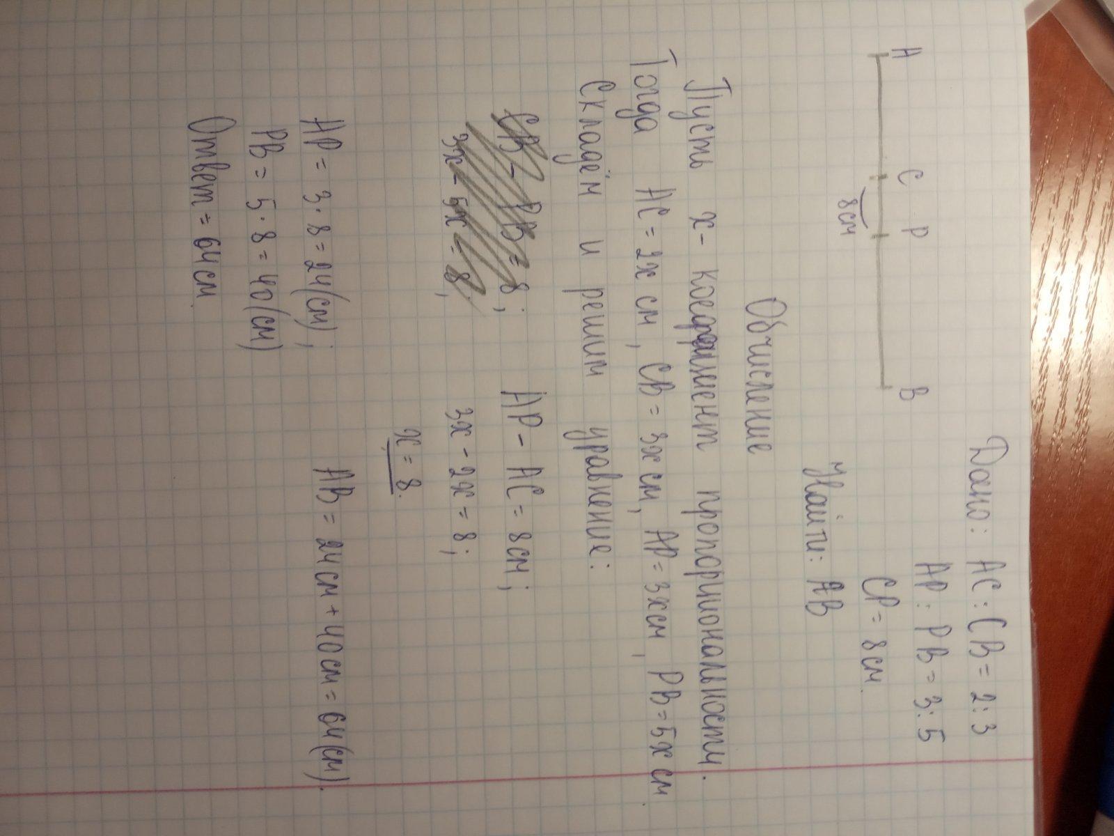 4.Отрезок АВ делится точкой С в отношении 2 : 3, а точкой Р в отношении 3 : 5. Расстояние между точками С и Р равно 8 см. Найти длину АВ.