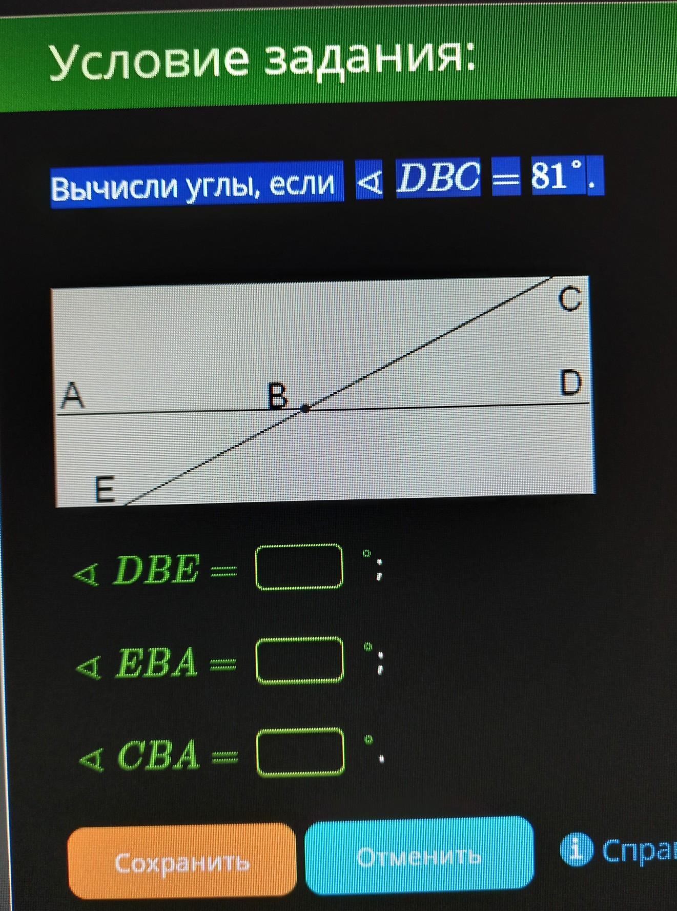 угол DBE=99 градусов, угол EBA = 81 градус, угол CBA=99 градусов