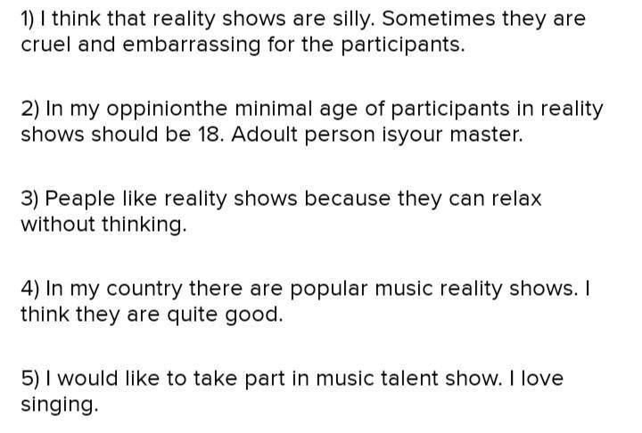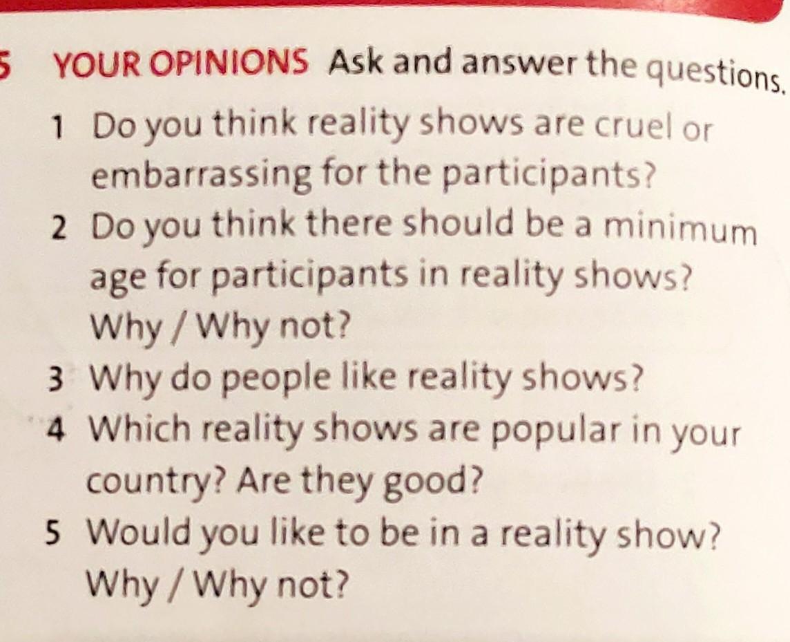 5 YOUR OPINIONS Ask and answer the questions, 1 Do you think reality shows are cruel or embarrassing for the participants? 2 Do you think there should be a minimum age for participants in reality shows? Why / Why not? 3 Why do people like reality shows? 4 Which reality shows are popular in your country? Are they good? 5 Would you like to be in a reality show? Why / Why not?