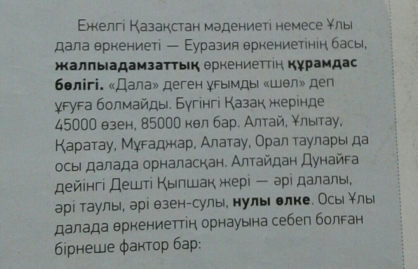 культура древнего Казахстана или цивилизация Великой степи - начало евразийской цивилизации, составная часть общечеловеческой цивилизации. Понятие "степь» нельзя трактовать как "пустыня". На сегодняшний день в казахской земле насчитывается 45000 рек, 85000 озер. В этой степи находятся горы Алтай, Улытау, Каратау, Мукаджар, Алатау, Урал. Дешт-и-Кипчакская Земля от Алтая до Дуная-Степная, горная, река-водная, нулевая. Есть несколько факторов, которые привели к установлению цивилизации в этой великой степи