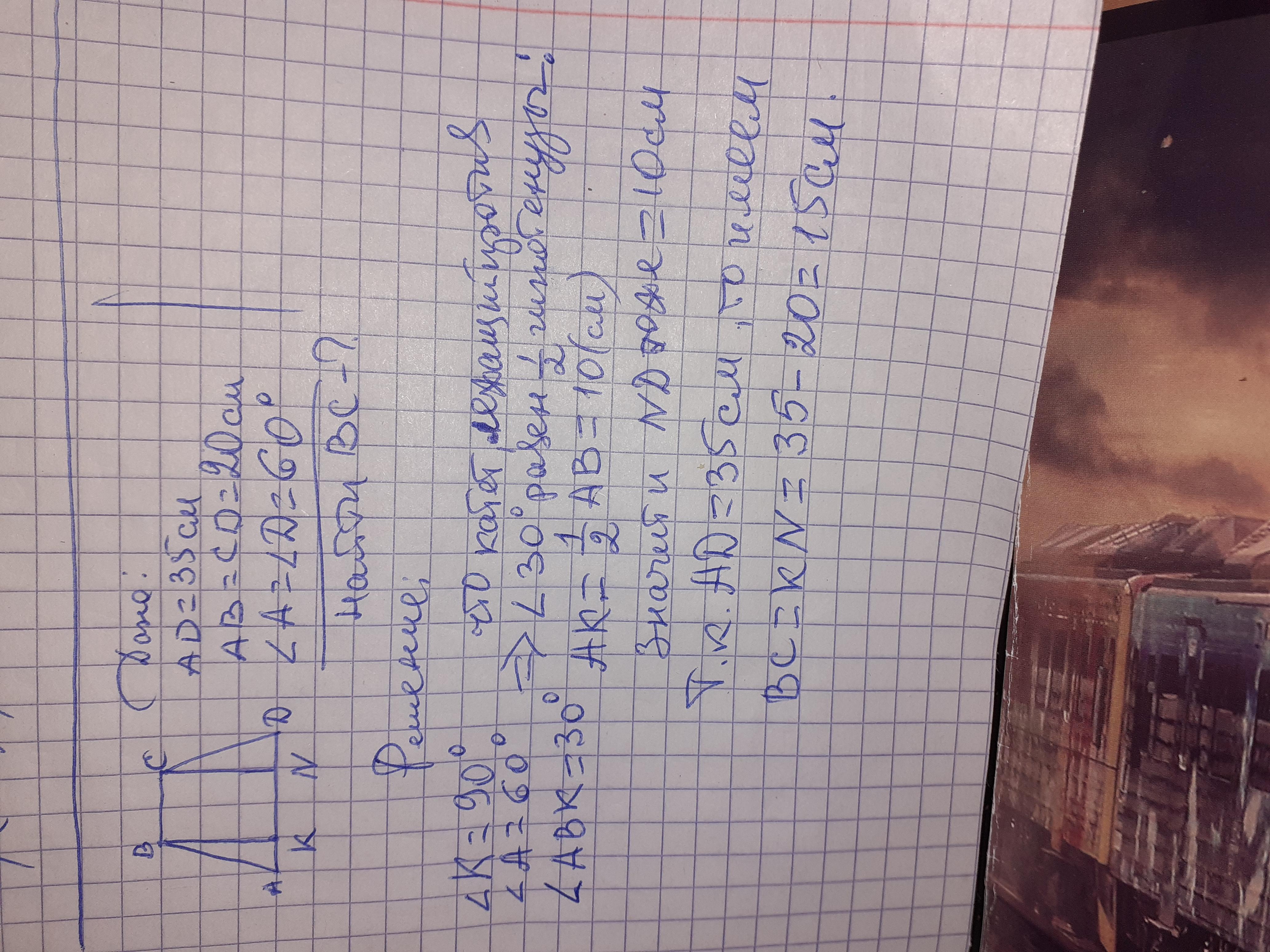 В равнобедренной трапеции большее основание 35,боковая сторона 20,угол между ними 60° Найти меньшее основание помогите(